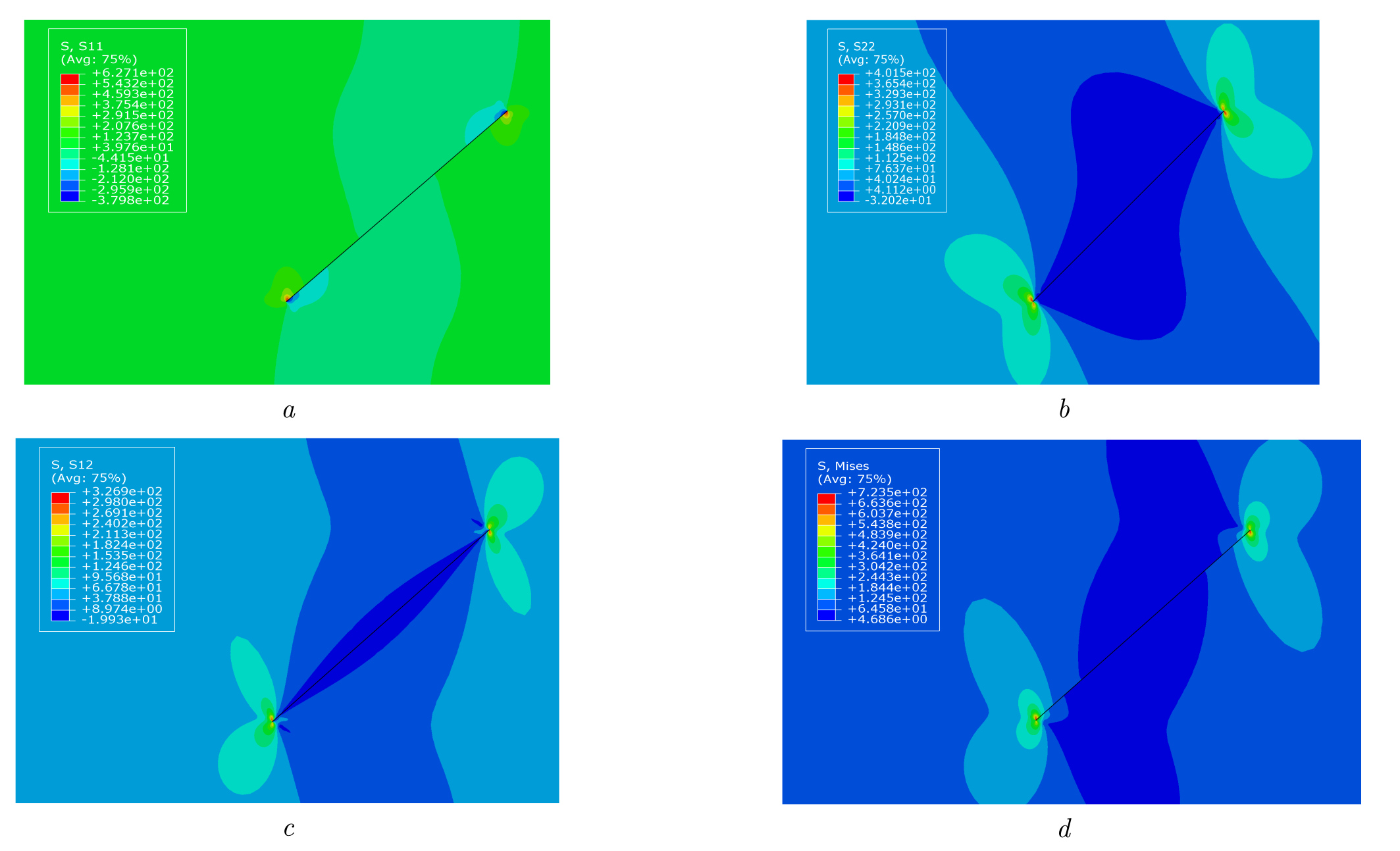 Рис. 2.2. Распределения компонент тензора напряжений и интенсивности напряжений для углов α = 60◦, β = 30◦: a — σ11, b — σ22, c — σ12, d — интенсивность касательных напряжений
