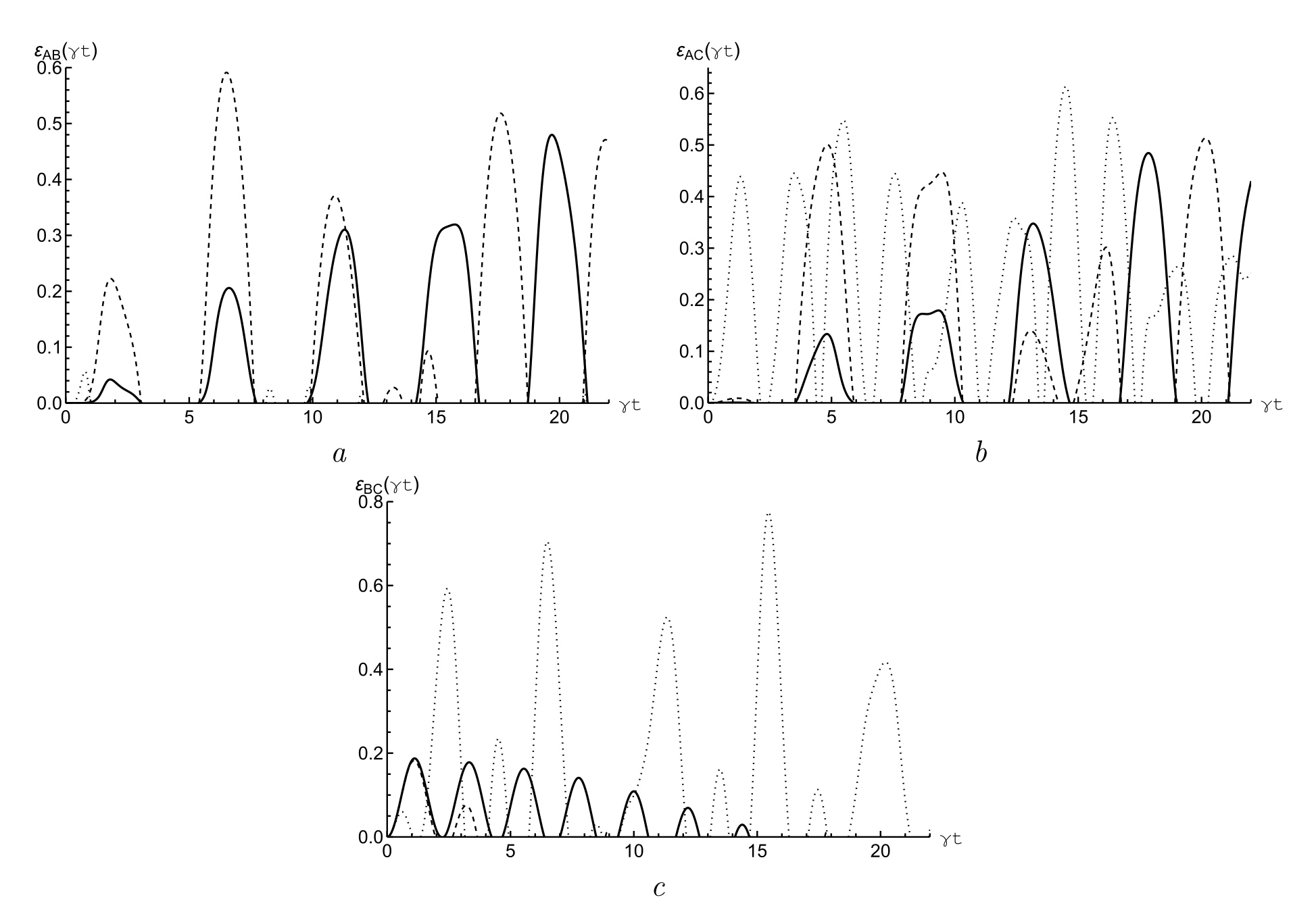 Для модели, изучаемой в настоящей статье, решения систем дифференциальных уравнений (10), (11) и (15), (16) имеют чрезмерно громоздкий вид. Поэтому в данной работе мы ограничимся численным решением указанных уравнений. Зная явный вид волновых функций (7), (8) и (12)–(14), мы можем вычислить временную матрицу плотности для полной системы, состоящей их трех кубитов и моды поля, по следующей формуле: