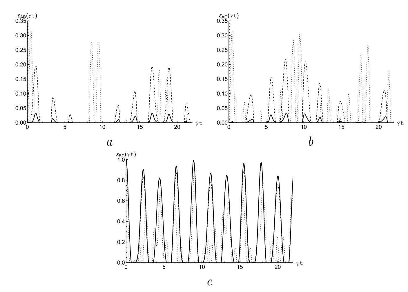 В некоторых работах было доказано, что диполь-дипольное взаимодействие играет существенную роль в эволюции квантовых корреляций [18–20], а также в динамике перепутанности [21]. Влияние диполь-дипольного взаимодействия на характер перепутанности между двумя идентичными двухуровневыми атомами в двухмодовом поле резонатора было исследовано в работе [22]. Результаты показали, что диполь-дипольное взаимодействие может привести к большей перепутанности между атомами, и эффект внезапной смерти также может быть ослаблен. Следует подчеркнуть, что диполь-дипольным взаимодействием атомов нельзя пренебрегать, когда расстояние между атомами меньше длины волны в резонаторе. В нашей предыдущей работе мы детально исследовали динамику перепутывания системы трех кубитов, два из которых резонансно взаимодействуют с модой квантового электромагнитного поля в резонаторе без потерь, а третий находится вне резонатора [23]. Представляет большой интерес обобщить полученные результаты на случай, когда между изолированным и захваченным кубитами присутствует диполь-дипольное взаимодействие.