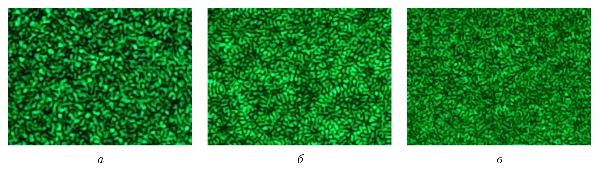Рис. 1. Характерные спекл-изображения: а) для открытой апертуры; для кольцевых апертур с б) 0,8 и в) 0,9 при одинаковом увеличении