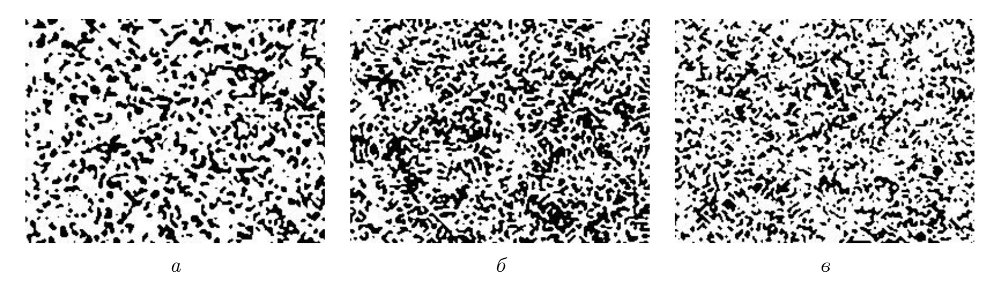 Характерный вид бинаризованных спекл-изображений: а) для открытой апертуры; для кольцевых апертур с б) 0,8 и в) 0,9 Typical appearance of binarized speckle patterns: a) for an open aperture; for annular apertures with b) 0.8 and v) 0.9