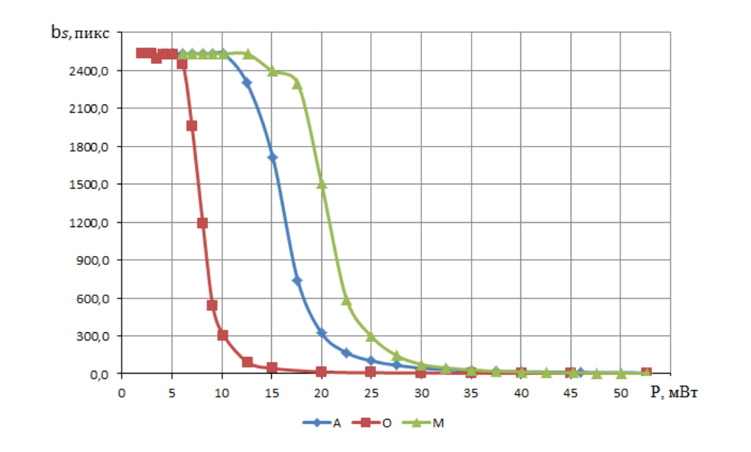 Fig. 7. Graph of the change in the average transverse size of the speckle from the laser illumination power for a circular aperture (O), annular with ε = 0, 8 (A), annular with ε = 0, 9 (M)
