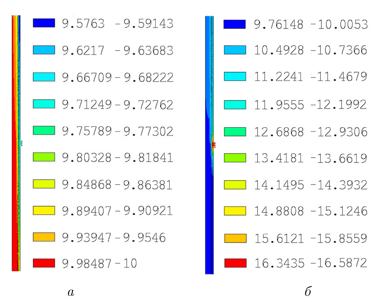 Рис. 2.3. Распределение температурного поля (◦C) в продольном сечении нефтепровода при толщине парафина 2 мм: а) при квазистационарном режиме до процесса нагрева; б) при квазистационарном режиме в процессе нагрева