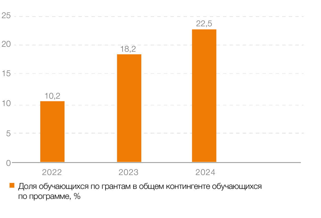Размеры гранта соответствуют стоимости обучения, а средства выделяются из городского бюджета в форме субсидий. Доля грантов в общем объеме мест на образовательной программе, меняющаяся от года к году (рис. 1), говорит о росте востребованности нового подхода. C 2022 по 2024 г. доля тех, кто обучается по грантам, в общем контингенте обучающихся по программе увеличилась более чем в два раза – с 10,2 до 22,5%.