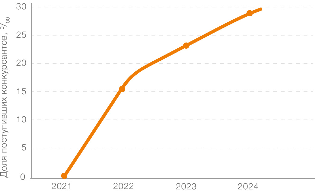 На конкурс поступает несколько сотен работ ежегодно, и все они касаются различных сторон городской жизни [2, с. 49]. Так, начиная с 2017 г. участниками стали 1487 школьников и студентов колледжей. Если в первый год за победу соревновалось всего 64 человека, то к 2023 г. число конкурсантов увеличилось почти втрое, до 172. В 2024 г. конкурс привлек 176 школьников из 70 образовательных учреждений Москвы и Московской области, представивших 128 проектов. В финал в 2024 г. вышли 33 проекта, из которых 14 стали победителями, а 31 работа удостоилась призовых мест второй и третьей степени. С 2022 г. увеличивается число талантливых школьников – участников и победителей, которые выбирают путь студентов Университета Правительства Москвы (рис. 2), воплощая свои идеи в конкретные шаги по созданию мегаполиса будущего.