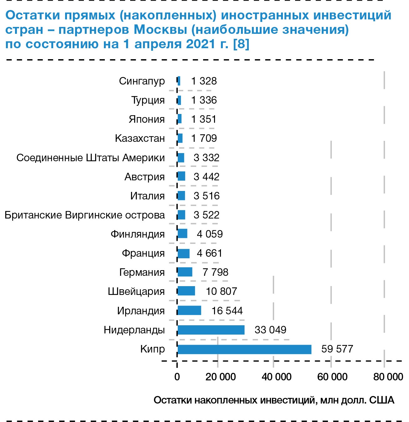 Рис. 1. Остатки прямых (накопленных) иностранных инвестиций стран – партнеров Москвы (наибольшие значения) по состоянию на 1 апреля 2021 г. [8]