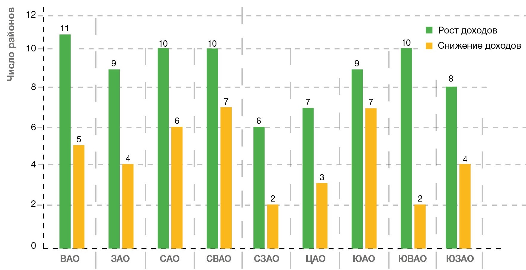 где Дт и Дп – доходы учреждения за текущий и за предыдущий годы соответственно. (Ткд не ниже 100% служит показателем положительной динамики доходов в исследованный период, а менее 100% – отрицательной.) Затем в каждом округе были подсчитаны количества ГБУ «Жилищник» с положительной динамикой и с отрицательной.