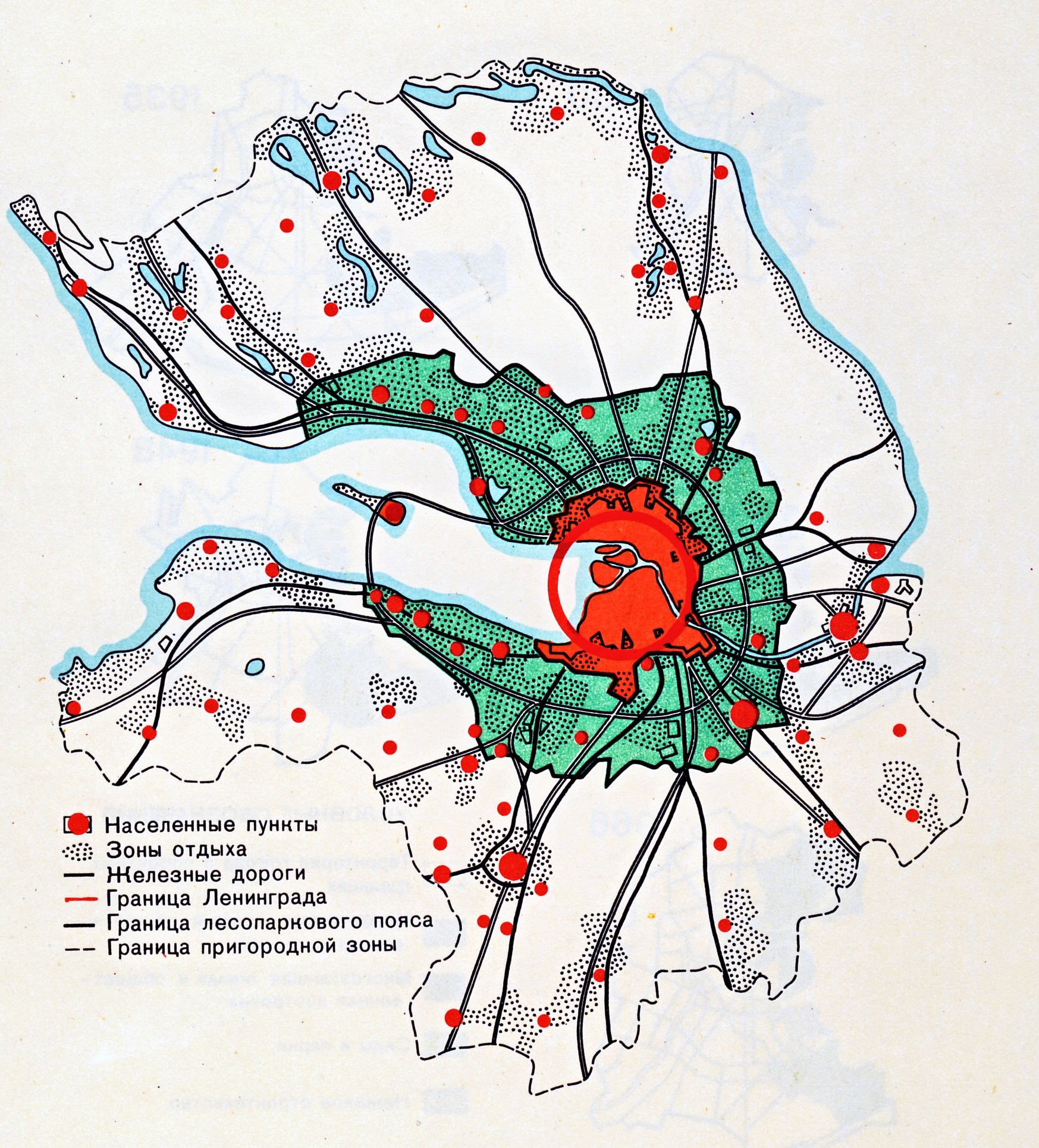 Утвержденный Советом Министров СССР в июне 1966 г. Генеральный план развития Ленинграда определил формирование города до середины 1980-х гг. (рис. 6, 7). Идея выхода города к берегам Финского залива, впервые заявленная в Генплане 1948 г., получила в новом Генплане дальнейшее развитие и реализацию. Однако многие идеи, заложенные в этом Генплане, в частности внутригородское транспортное полукольцо, позднее реализованы не были [2, с.110].