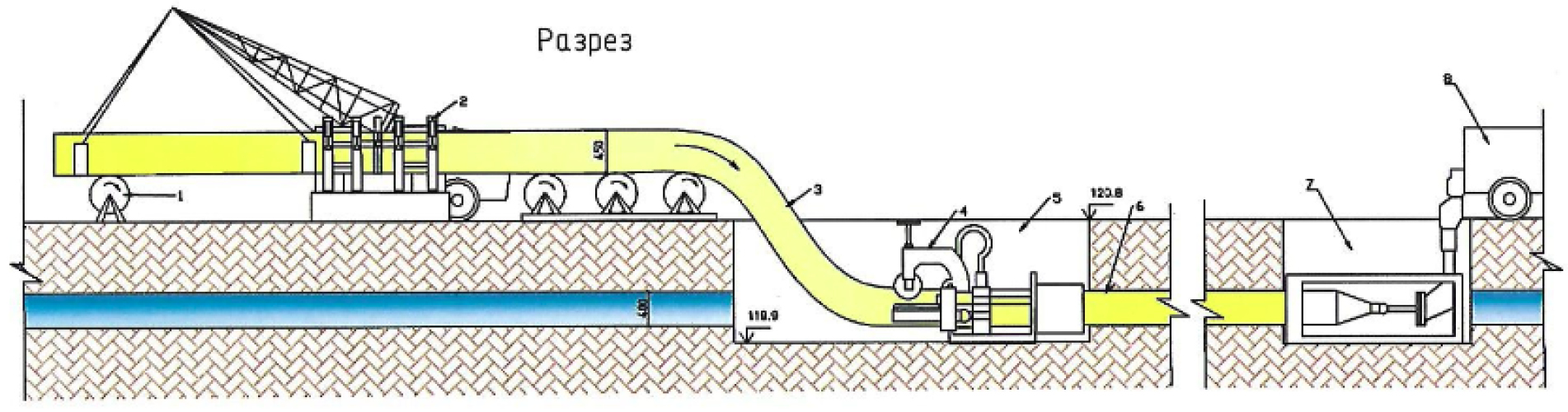 Рис. 1. Схема восстановления трубопровода по методу Swagelining: 1 – барабан; 2 – аппарат для сварки полиэтиленовых труб; 3 – исходная полимерная труба, подвергающаяся термомеханическому сжатию; 4 – устройство для протягивания полимерного трубопровода с топочной камерой и конической матрицей (сужающим устройством); 5 – стартовый котлован; 6 – труба, подвергаемая восстановлению; 7 – финишный колодец; 8 – тянущая машина (лебедка)