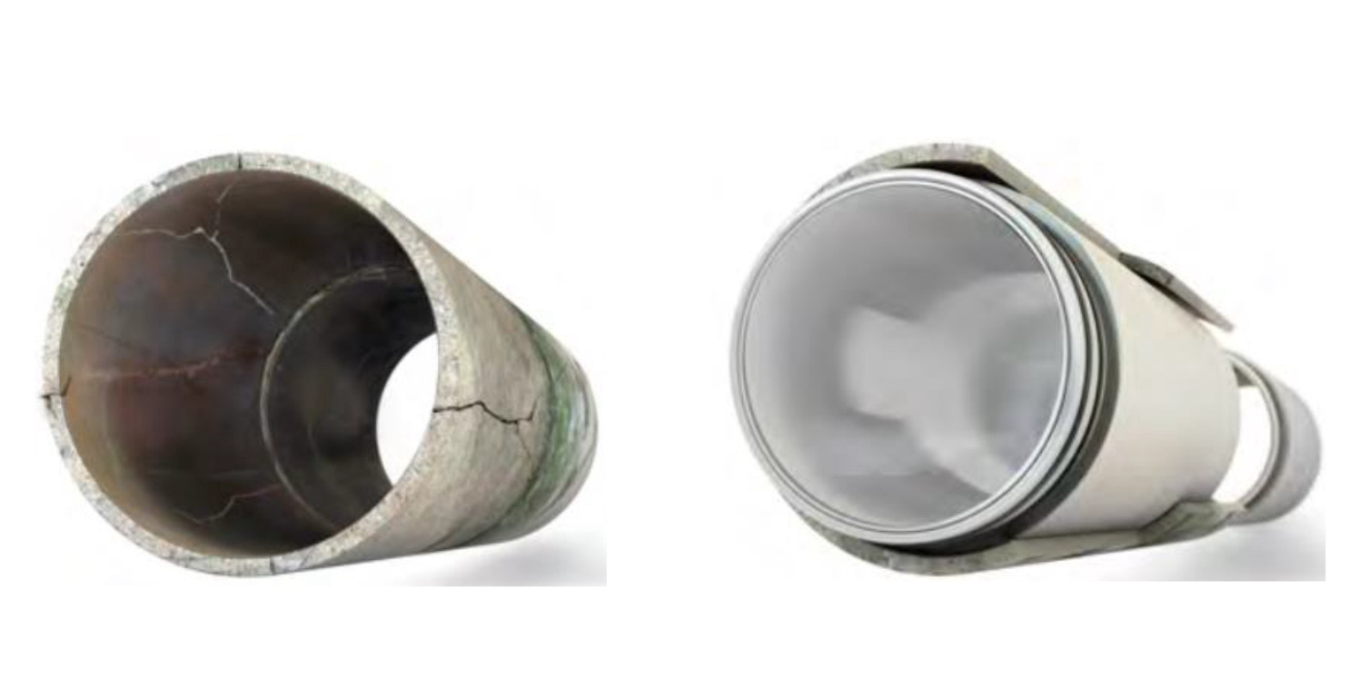 Обратный процесс деформации полимерной трубы в ветхом трубопроводе происходит автоматически за счет эффекта «памяти». Труба расширяется до тех пор, пока ее внешний диаметр не достигнет размера внутреннего диаметра старого трубопровода и не образует с его стенкой плотного соединения. При этом отпадает необходимость применения цементного раствора или специальных отвердителей.