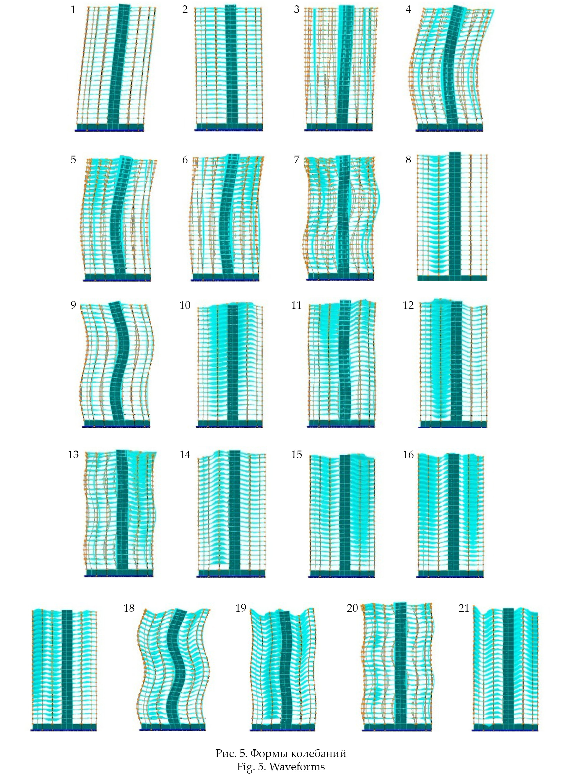 Период колебаний рассчитывался с использованием модального анализа поврежденной схемы, в ходе которого была рассмотрена 21 форма колебаний (рис. 5). В результате была выбрана наиболее подходящая форма под номером 8 с периодом колебаний 0,52 с. Время интегрирования установлено равным 4 с, при шаге интегрирования 0,01с.