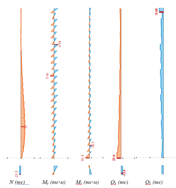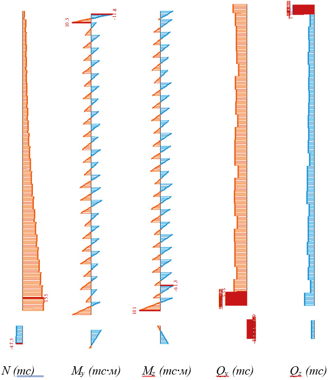 Рис. 6. Эпюры усилий в колоннах, полученные в ходе линейного статического расчета