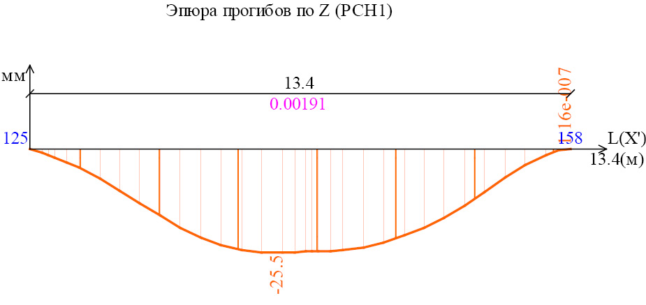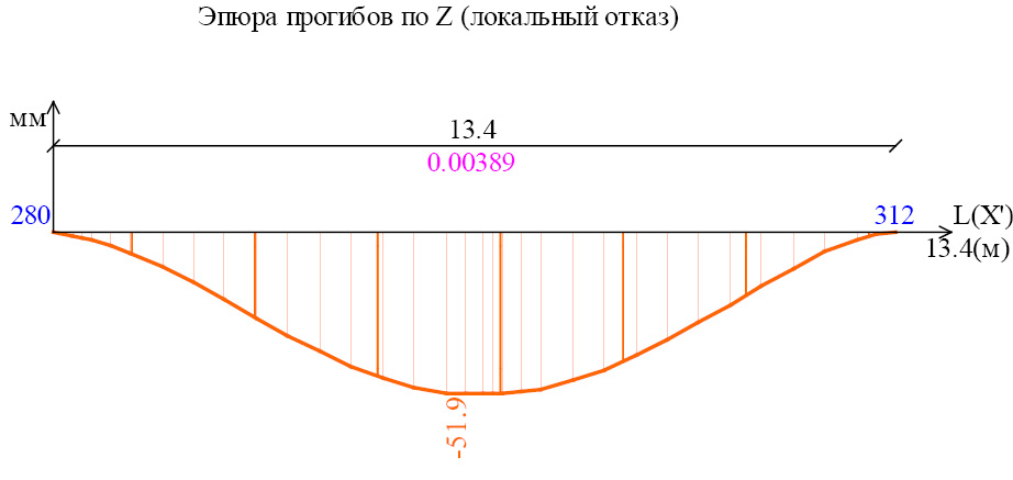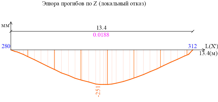Рис. 10. Эпюра прогиба плиты перекрытия в месте над удаляемой колонной для линейного статического расчета
