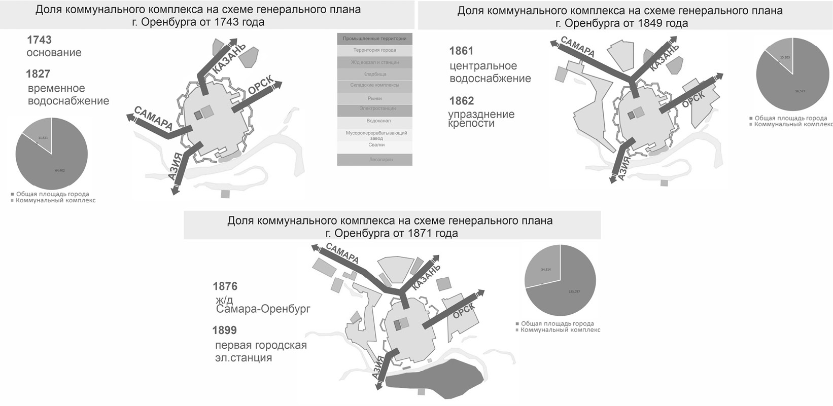 Рис. 1. Схемы размещения объектов коммунального комплекса города Оренбурга 1743, 1849 и 1871 гг. с выявлением их доли в общем балансе городских территорий