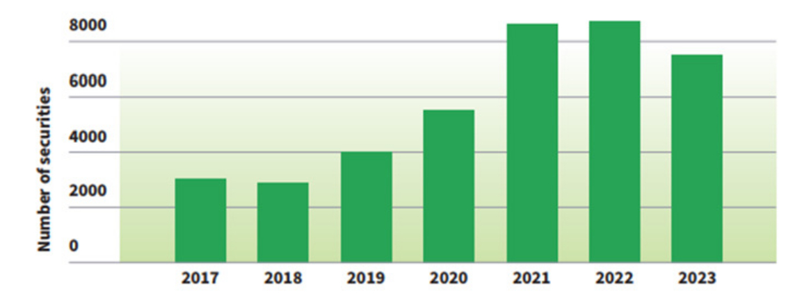 На указанных графиках (рис. 1–3) видно, что объем размещенных ESG и GSS+ облигаций в мире в 2023 году начинает расти, и в 2024 году, предположительно, будем наблюдать стабилизацию или умеренный рост. При этом динамика объема размещенных зеленых облигаций в мире в 2023 году продолжила падение, но мы можем предположить, что в 2024 год у перейдет к умеренному росту.