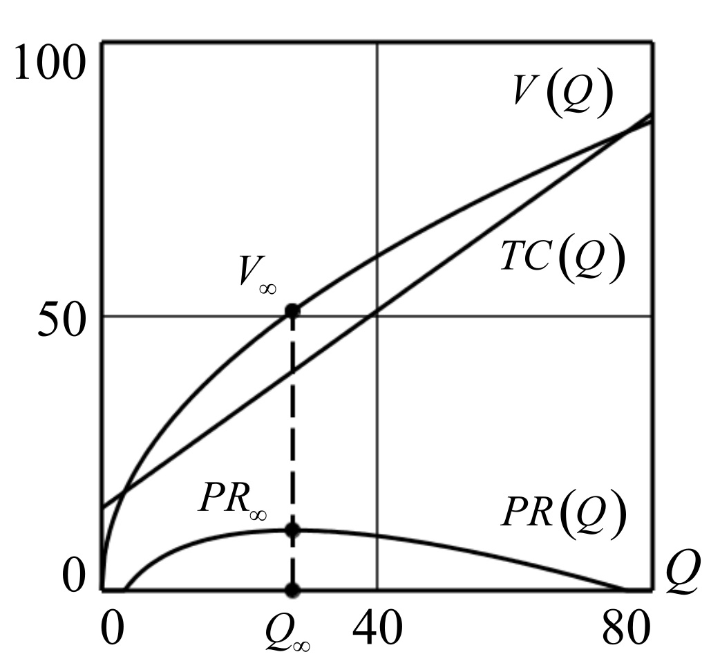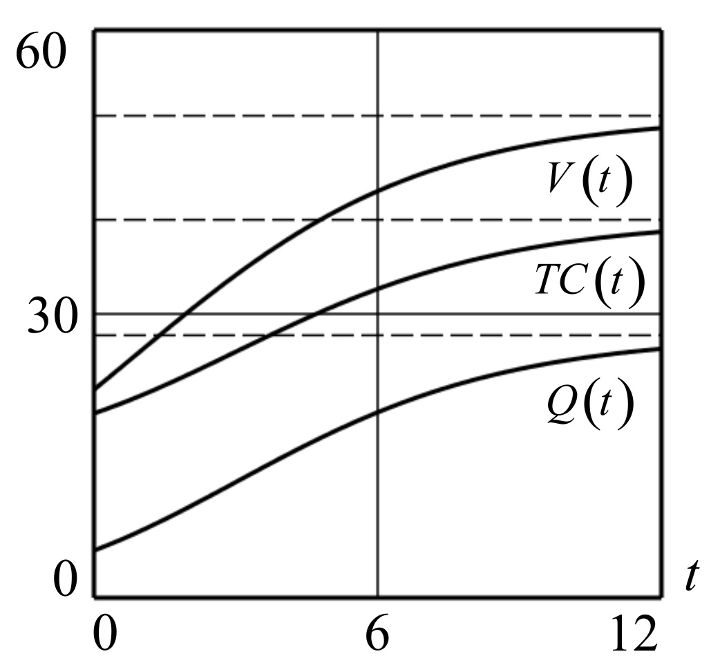 Рис.2: График кривой функции производственного фактора Q=Q(t), полученный в результате численного решения задачи Коши (9), (10), и графики производственной функции V(t)=P*Qa(t) и функции издержек TC(t)=H*Q(t)+TFC. Расчетные значения: P=10; a=0.49; H=0.9; TFC=15; Q0=0; Q∞=27.736; V∞=50.944; PR∞=10.981, λ=0.667.