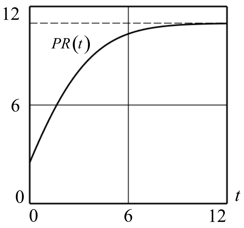 Рис.4: График кривой функции прибыли PR(t)=P*Qa(t)-H*Q(t)-TFC, полученный в результате численного решения задачи Коши (9), (10), для значения V∞≥Vmax. Расчетные значения: P=10; a=0.49; H=0.9; TFC=15; Q0=0; Q∞=27.736; V∞=50.944; PR∞=10.981, λ=0.667.