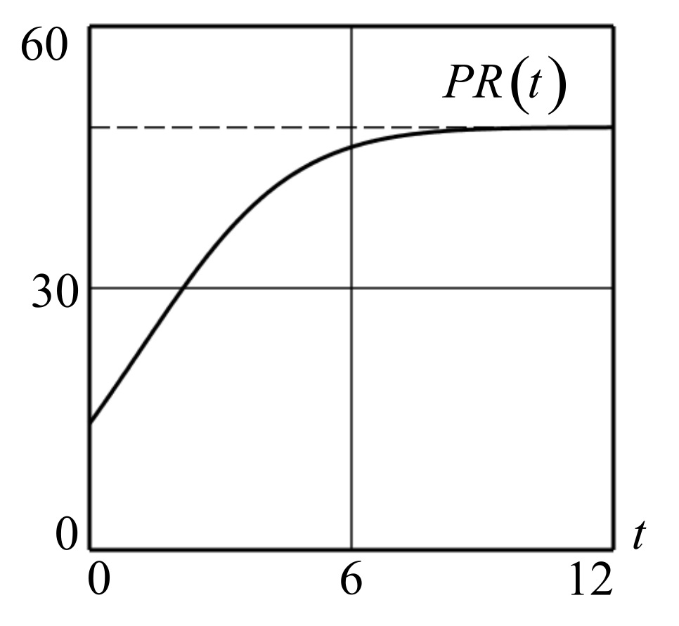 Рис.3: График кривой функции прибыли PR(t)=P*Qa(t)-H*Q(t)-TFC, полученный в результате численного решения задачи Коши (9), (10). Расчетные значения: P=10; a=0.49; H=0.9; TFC=15; Q0=0; Q∞=27.736; V∞=50.944; PR∞=10.981, λ=0.667.