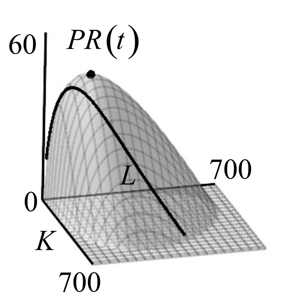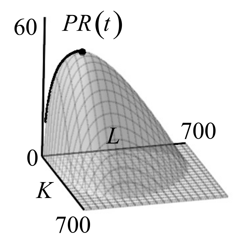На рис. 8 показан пространственный вариант графика кривой функции прибыли , полученный в результате численного решения задачи Коши (19), (20) и рассчитанный по формуле (13). Здесь кривая расположена на поверхности прибыли, достигая ее максимального значения.