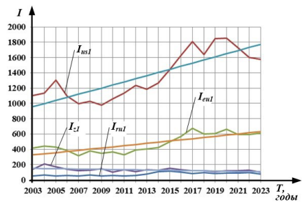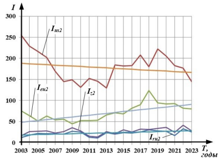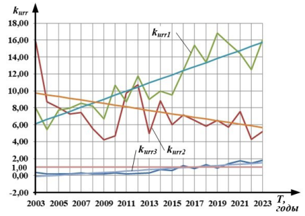 где Т — годы рассматриваемого периода 2003– 2023 гг.