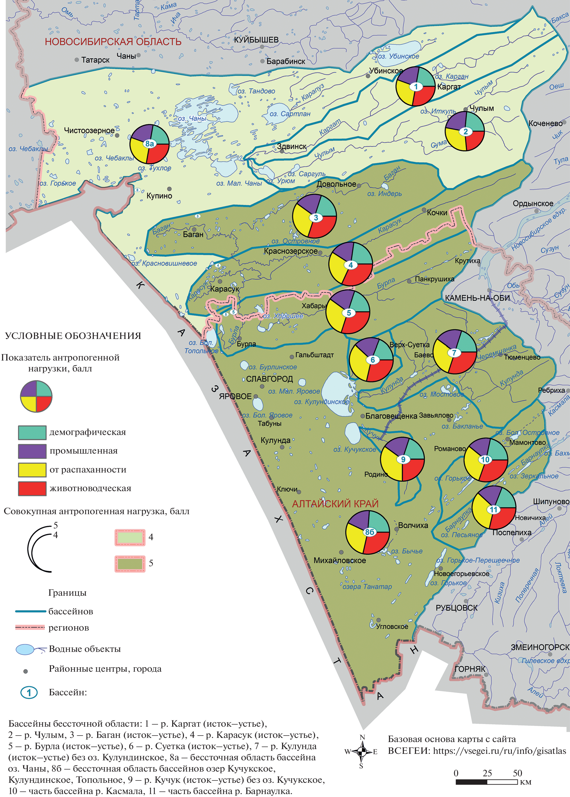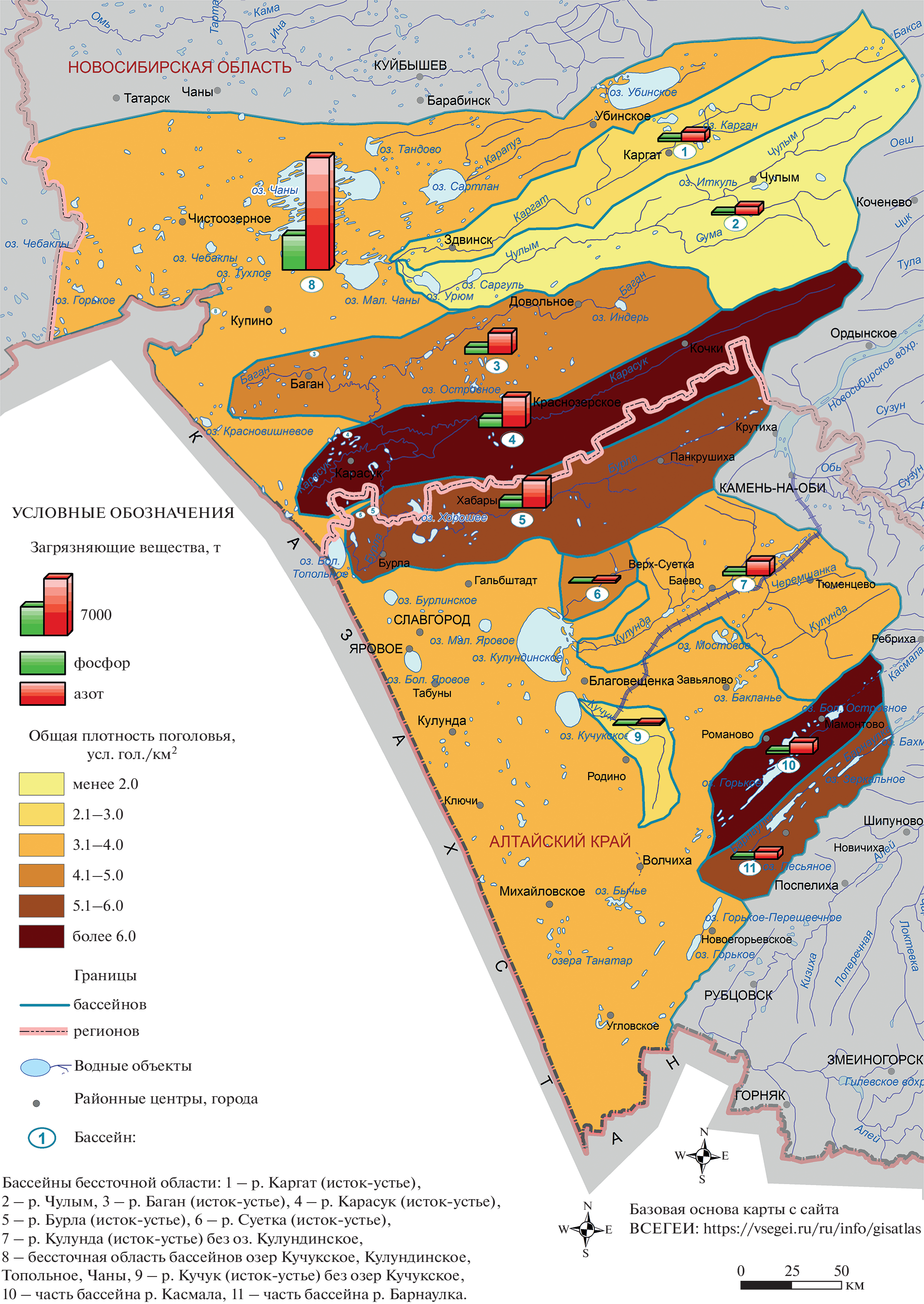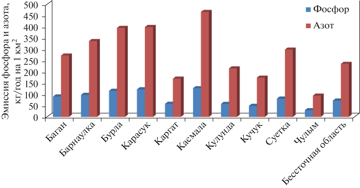 Anthropogenic load was assessed using two groups of indicators of direct (organized) and indirect (diffuse) impacts on the example of small rivers in the closed region of the Ob−Irtysh interfluve. Among the many assessment methods, those that have been tested in geographic and hydrological studies have been selected. Detailing and verification of the results of the assessment was carried out using remote sensing, field research, chemical-analytical and statistical methods. The assessment showed that the main sources of pollution of water bodies are the territories of rural settlements, livestock farms (complexes), areas for walking livestock and poultry, household waste dumps and municipal solid waste, that is, sources of diffuse pollution. There is a higher level of load within the drainless region of the Altai krai in comparison with the Novosibirsk oblast, which is associated with a more intensive development of the agricultural sector of the region’s economy. An inventory of sources of anthropogenic impacts by remote sensing methods revealed some difficulties, such as difficulties in determining existing facilities and their uses, a mismatch in the number of livestock complexes identified using the register of organizations and by visual interpretation of space images. The analysis of calculated data on phosphorus and nitrogen loads on individual water bodies is confirmed by estimates based on the results of field hydrological and hydrochemical studies.