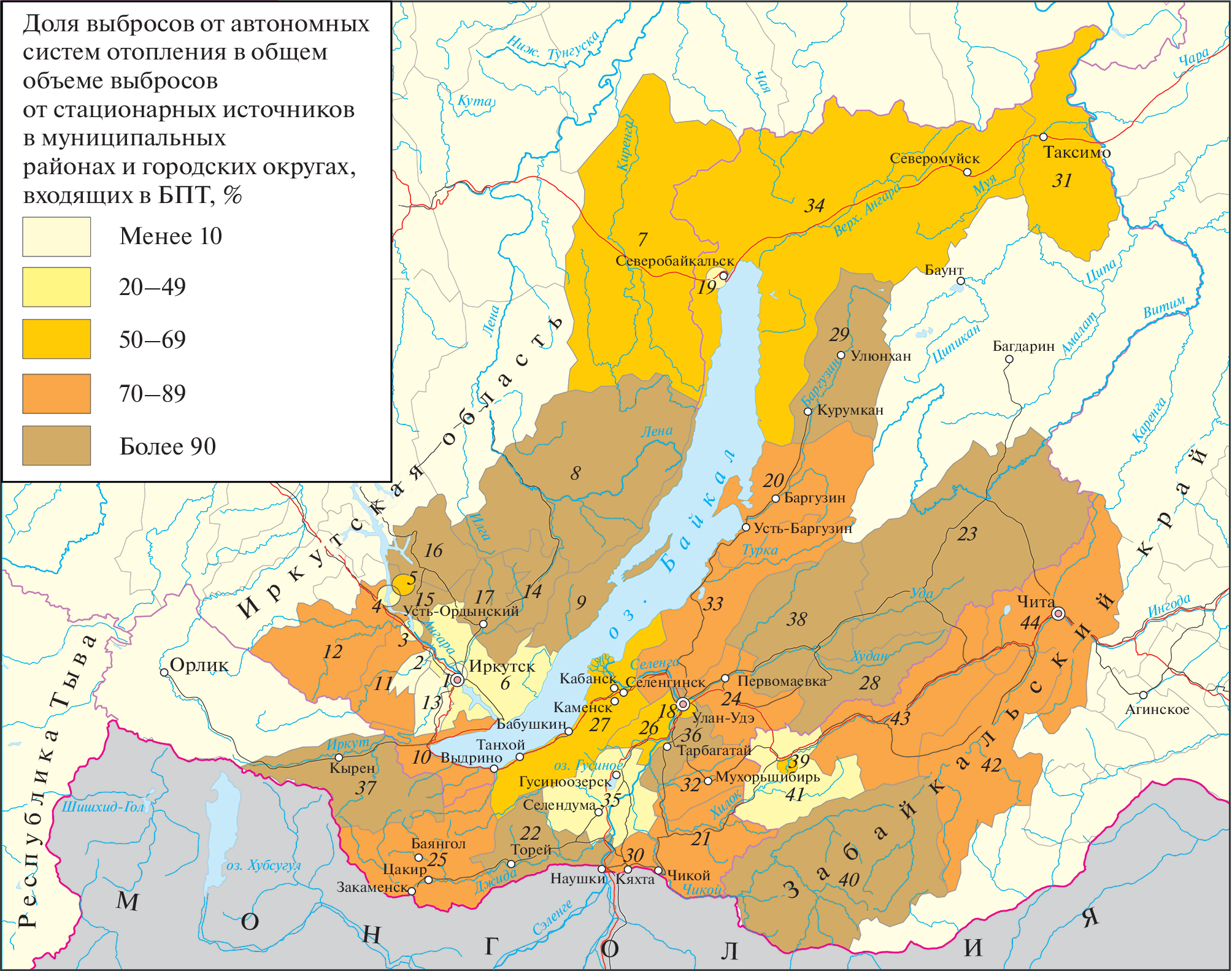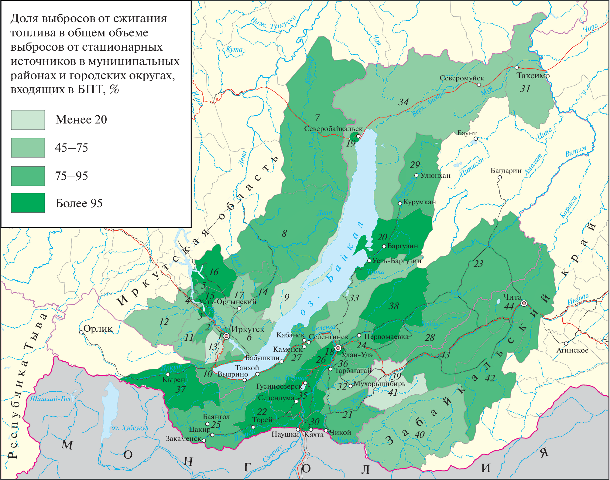 The article developed an algorithm for the integral assessment of anthropogenic impact (AI) with spatial discreteness for municipalities of the Baikal Natural Territory (BNT). It includes 21 normalized indicators for the 2014–2020 period, aggregated into 7 sub-indices (impact on the atmosphere, water, forest resources, agricultural impact, solid waste, disturbed lands and objects of accumulated harm, as well as background impact). To determine the weight of the indicators, a survey was conducted of experts representing the scientific community (specialists in the field of integrated assessments of certain types of impacts or in the field of environmental problems of the BNT), the expert community (leading rating agencies) and representatives of the environmental management system of the regions included in the BNT. The integral indicator made it possible to build a rating of municipalities and identify key factors in the formation of the environmental situation. According to the integral index, five types of territories are identified, subtypes are distinguished by the nature of the impact on the environment. A high level of AI is typical for large cities and localities of enterprises, especially mining, in which a full set of load components operates. The increased level is observed in cities, suburban municipalities with a high burden from the vital activity of the population, as well as in large agricultural areas with a developed extractive industry. The average level of AI is typical for a small number of rural areas and small towns due to the load from agriculture and forestry. The reduced level of impact is formed mainly in semi-peripheral areas, where the load on forest resources plays a special role, and some suburban areas with more developed agriculture. A low level of AI is typical for peripheral, sparsely populated municipal units with a noticeable proportion of pollution from heating oil in residential housing. For BNT, a special role in the formation of the ecological situation is played by large tracts of disturbed land, high volumes of solid waste generation and objects of accumulated damage left over from the period of Soviet industrialization.