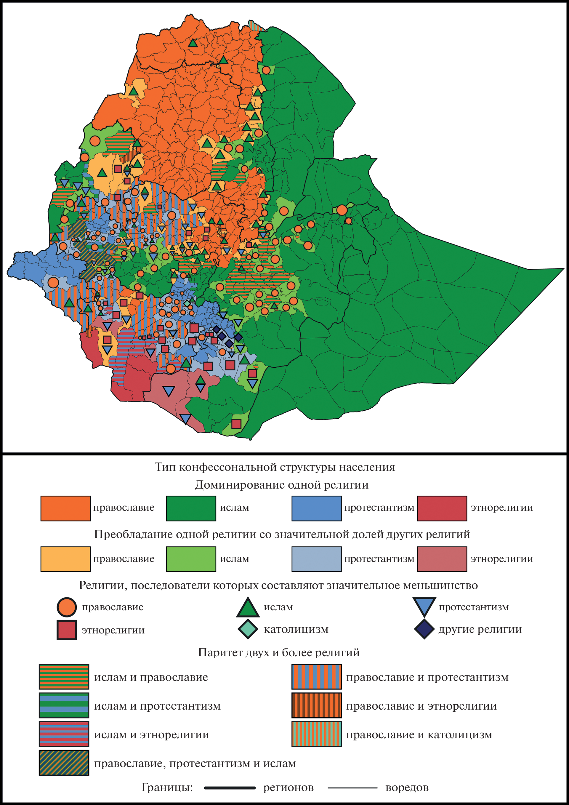 The article defines the patterns of development of the Ethiopian religious landscape in the context of a significant expansion of religious freedoms that began after 1991. The country’s population censuses for 1994 and 2007 were used as the statistical base of the study. It contains information on the religious affiliation of the population of Ethiopia as a whole and its administrative-territorial units up to the Woredas–the 3rd level of administrative units. The directions of shifts in the distribution of followers of the country’s largest faith-groups (Orthodox, Muslim, Protestant, ethnic religions) were determined based on the types of religious composition of the population. This allowed us to reveal the features of the Ethiopian religious landscape with a high level of detail. The defined trends in the development of the Ethiopian religious landscape are reflected in the maps illustrating the dynamics of the types of confessional structure of the woreda population for 1994 and 2007. Based on cartographic information, the author determined the patterns of reconfiguration of the geospaces of the largest faith-groups in the country, that provoked an increasing polarization in the Ethiopian religious landscape. Determined that the religious structure of the population of the regions dominated by Orthodox Christianity, Islam, and Protestantism has become more homogeneous, while the main direction of the development of their geospaces was their expansion towards the capital of Ethiopia. As a result, specific spatial structures, such as frontiers, were formed. The intensification of religious competition in Ethiopia, which until recently was considered the “standard” of peaceful inter-communal relations in Africa, was accompanied by the growth of religious and ethnoreligious conflicts. It is established that it was partly due to the change in the religious structure of the urban population, resulted from a sharp increase in the proportion of Protestants and Muslims. Ethiopia faced the growing involvement of religious organizations in socio-political processes against the background of the aggravation of religious competition and interethnic rivalry. This contributed to the strengthening of centrifugal tendencies in the political life of Ethiopia, which have serious implications, for instance the unbundling of several administrative-territorial units in the southwestern and central parts of the country.