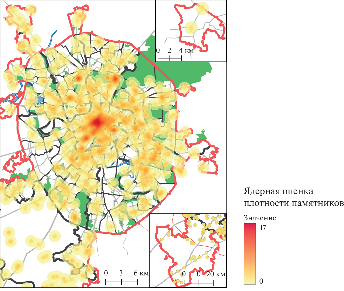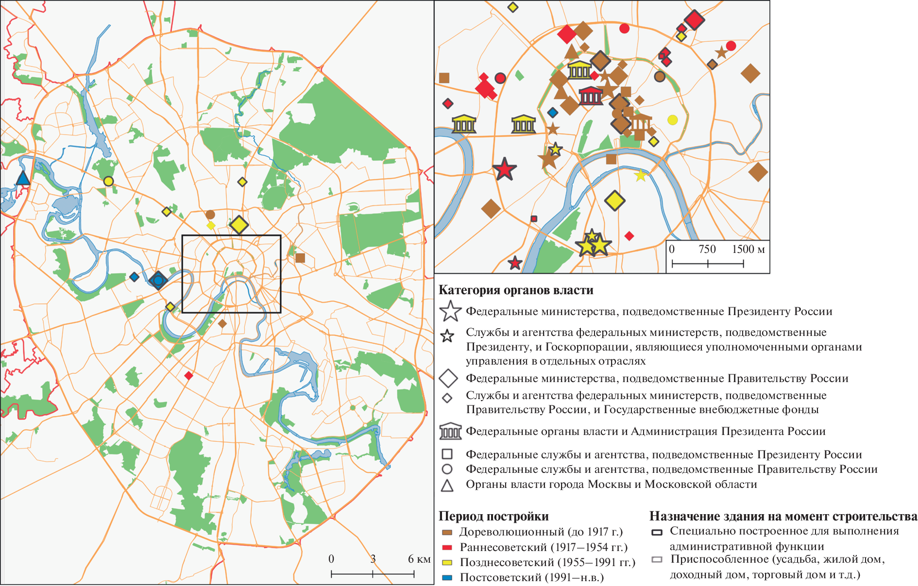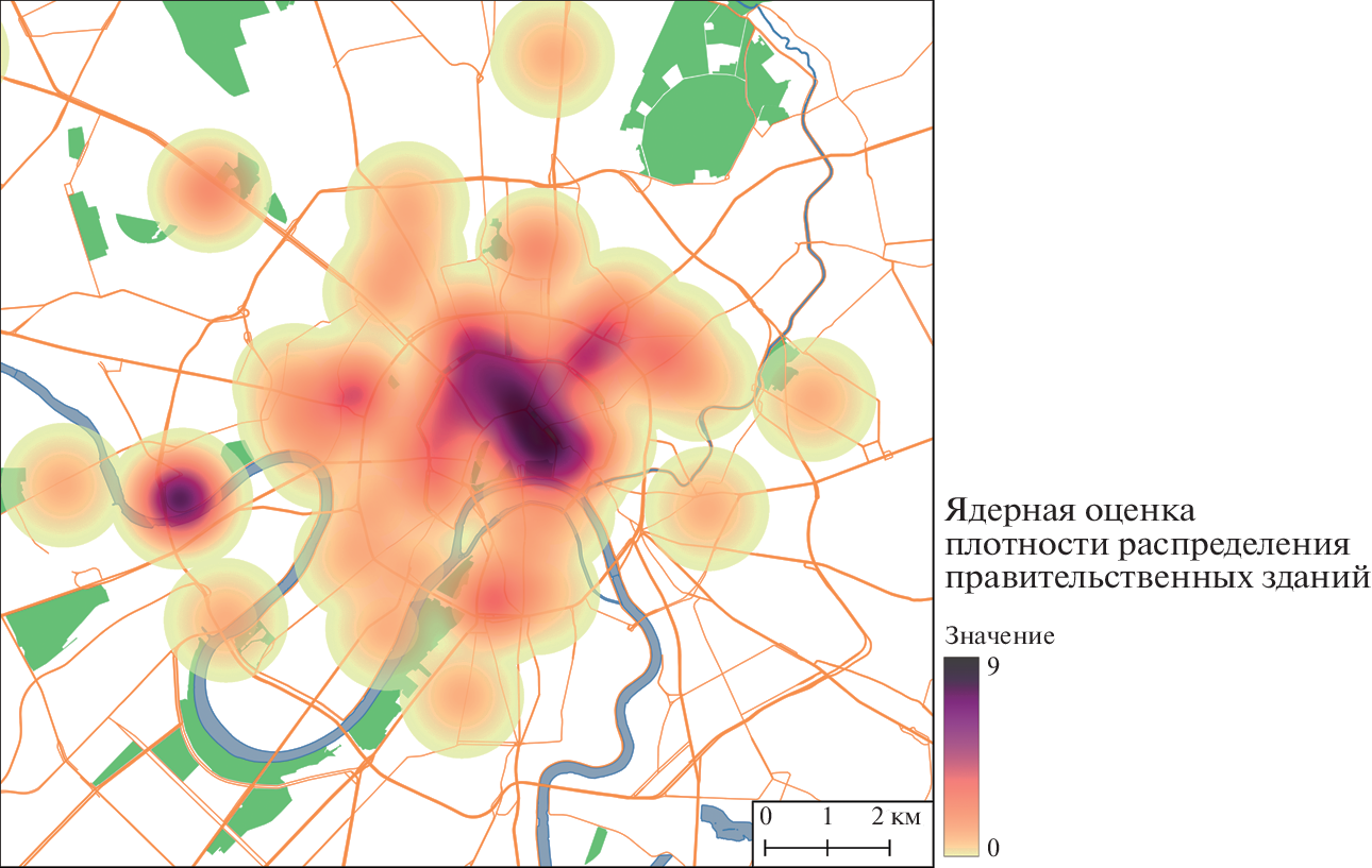 The urban environment of Moscow is considered through the concept of the political landscape as a complex of environment-shaping, representative objects. The image of the capital is not only the political history of the state, captured in buildings and monuments, but also a mirror of the representations of the national elite about its social support, development prospects, the outside world, and diverse social ideas about space. Official buildings as the focus of the political and administrative functions of the capital and city monuments are shown in the study as the dominant categories of place, a matrix of new representations that determine the evolution of the urban political and symbolic landscape. The objective of the study is to trace the stages of evolution of the most important material elements of the Moscow political landscape: the location, the construction time, the origin, and other features of the buildings of state institutions and monuments. The features of the modern spatial distribution of government buildings and monuments are studied. The historical hyperconcentration of government buildings in the capital center has been confirmed. Two large areas of high concentration of government buildings are identified: around Lubyanka, Kitai-Gorod, Staraya and Novaya squares and within the Moscow City business complex, as well as the relationship between the significance of a government agency and proximity to the Presidential Administration and the Kremlin as the main centers of decision-making. Despite the transfer of several federal agencies outside the center, there has not yet been a noticeable spatial decentralization of the administrative functions of the capital. In turn, the geography of the monuments repeats the general patterns of the capital plan. Their location reveals the radial-ring and sectoral structures of the city, as well as the specialization of districts. The absolute dominants of the landscape are the monuments dedicated to the heroes and events of the Great Patriotic War (more than 40% of the total number of monuments), which is one of the basics of modern Russian identity. The importance and significance of many capital monuments as an element of the political landscape is based on a strong long-term discourse. Despite some changes (the installation of monuments to rehabilitated public and political figures, victims of new wars and terrorist acts, as well as orthodox monuments), the monumental landscape of the capital is quite stable.