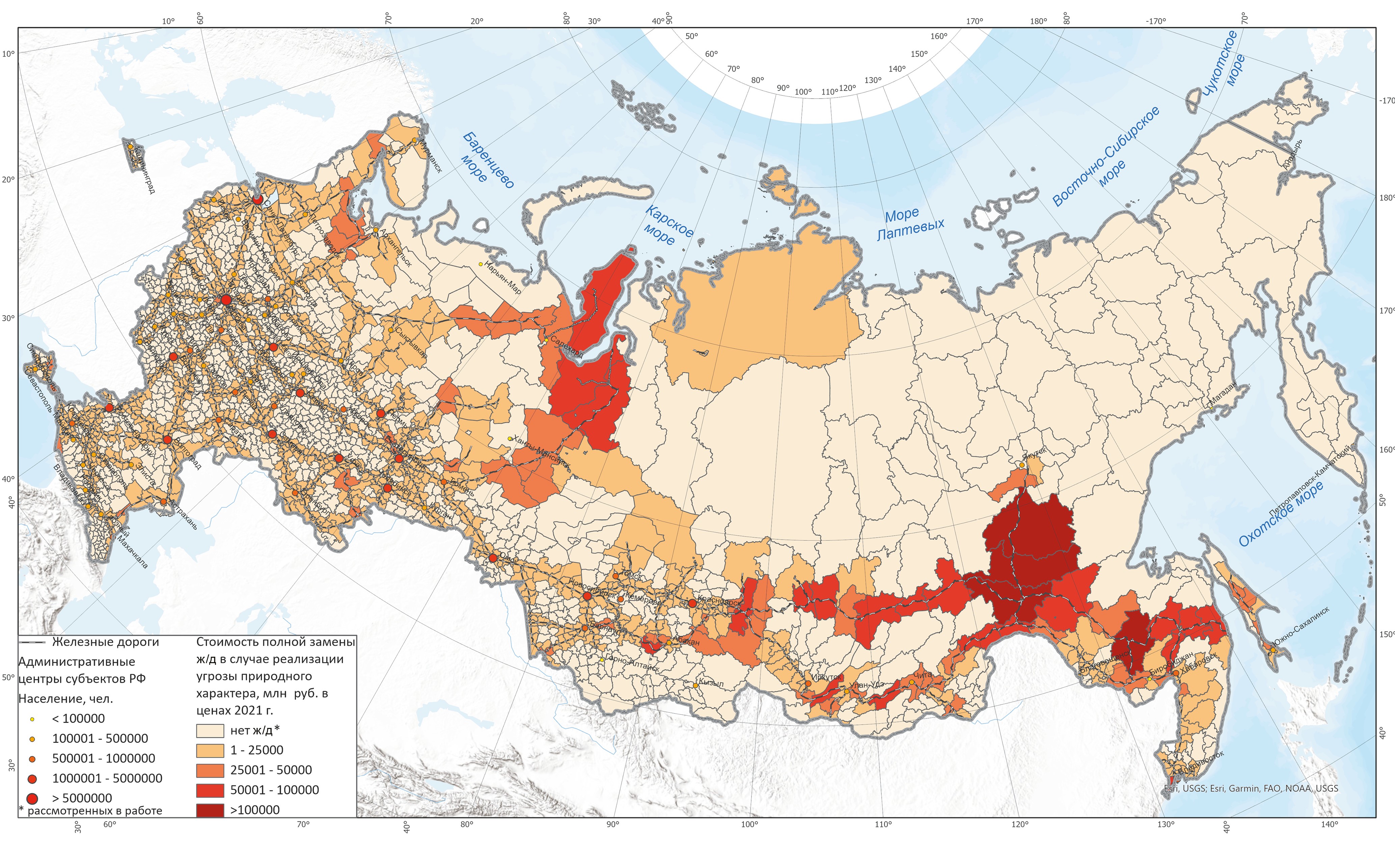 Рис. 1. Предельная стоимость замены железнодорожных линий в случае реализации угроз природного характера в разрезе муниципальных образований Российской Федерации (в ценах 2021 г.).