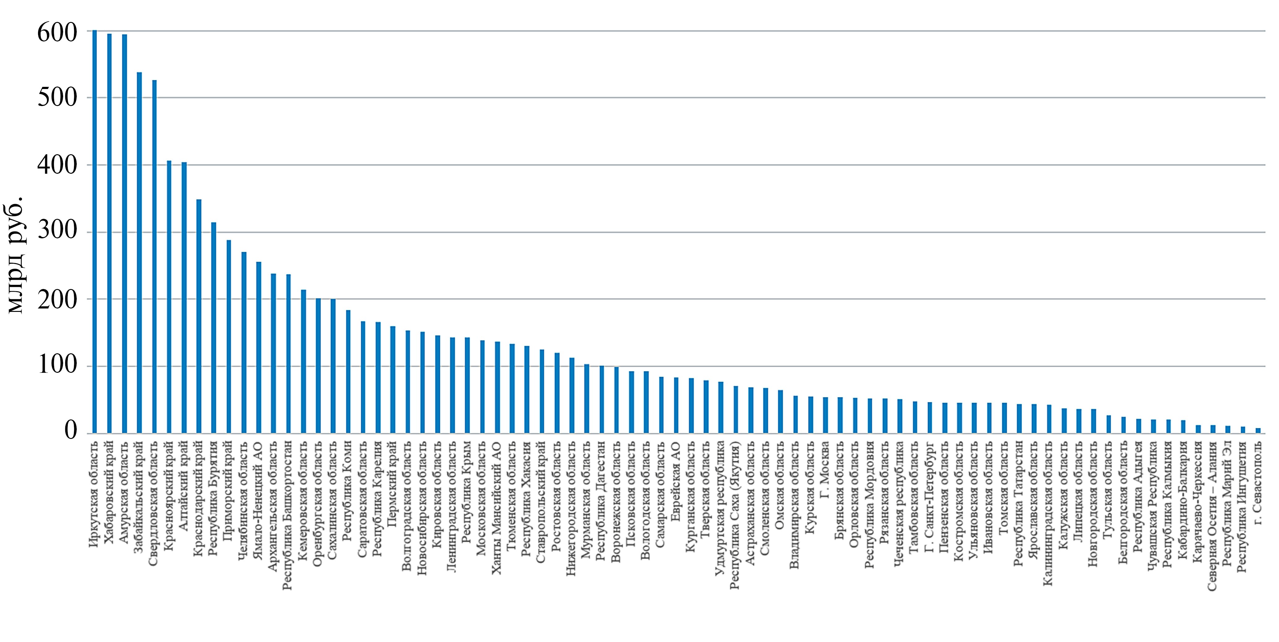 В региональном разрезе (рис. 2) на первые по величине предельного размера вероятного ущерба 10 регионов приходится свыше 40% всей восстановительной стоимости: Иркутская область – 602.4 млрд руб., Хабаровский край – 595.5 млрд руб., Амурская область – 594.4 млрд руб., Забайкальский край – 538.2 млрд руб., Свердловская область – 526.8 млрд руб., Красноярский край – 406.8 млрд руб., Алтайский край – 404.3 млрд руб., Краснодарский край – 348.5 млрд руб., Республика Бурятия – 314.1 млрд руб., Приморский край – 287.7 млрд руб. Следовательно, именно эти регионы требуют особого внимания в плане мер по защите основных фондов железнодорожного транспорта. Вместе с тем большинство из этих субъектов являются и одними из наиболее подверженных рассматриваемому кругу природных опасностей (наводнениям, опасным склоновым процессам, а регионы, находящиеся в пределах криолитозоны, – еще и геокриологическим опасностям)4. Кроме того, некоторые из них принадлежат к сейсмически опасным районам, что требует еще более детальных оценок вероятного ущерба для зданий и сооружений железнодорожного транспорта.