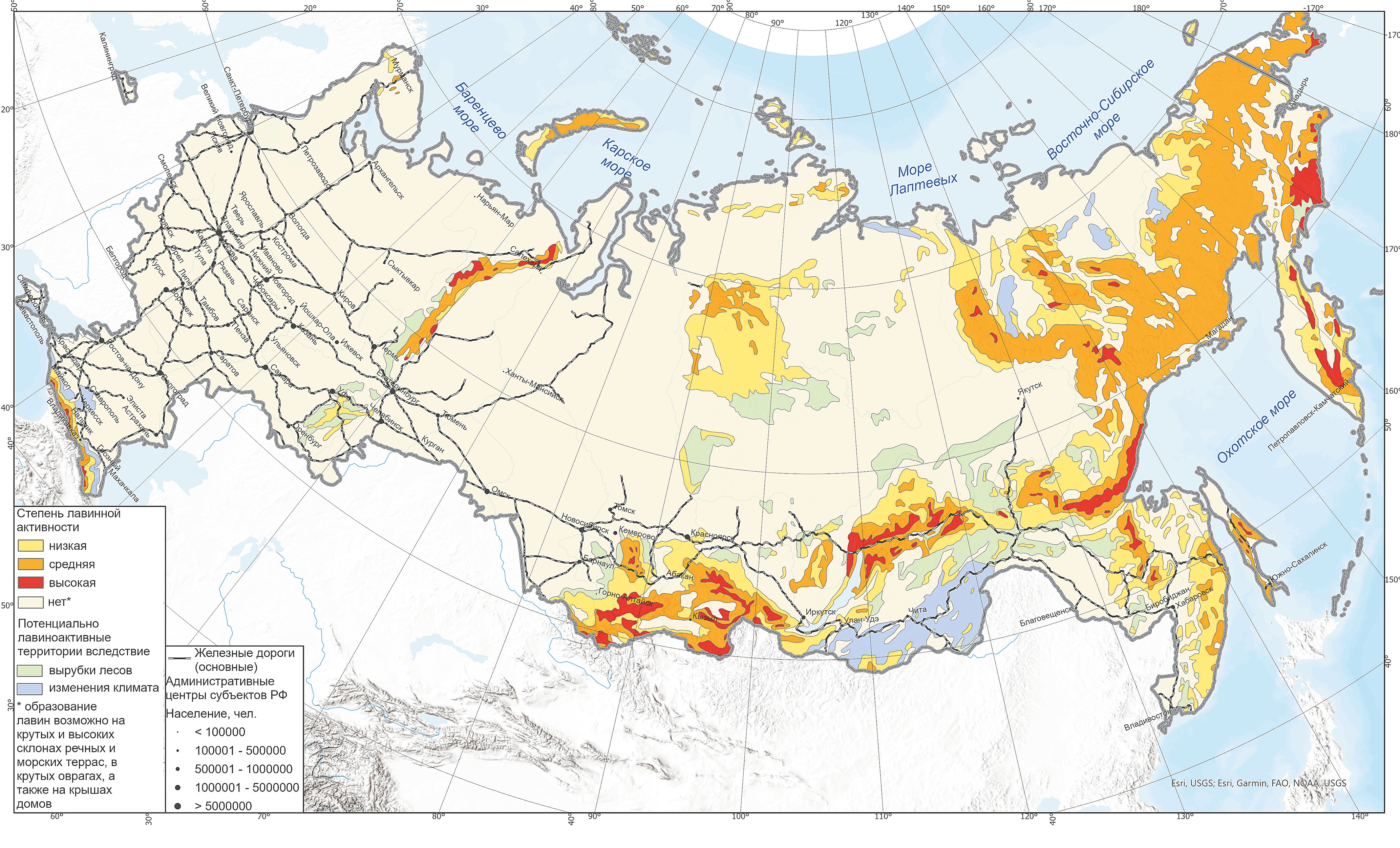 Рис. 3. Железные дороги Российской Федерации в ареалах лавинной активности.