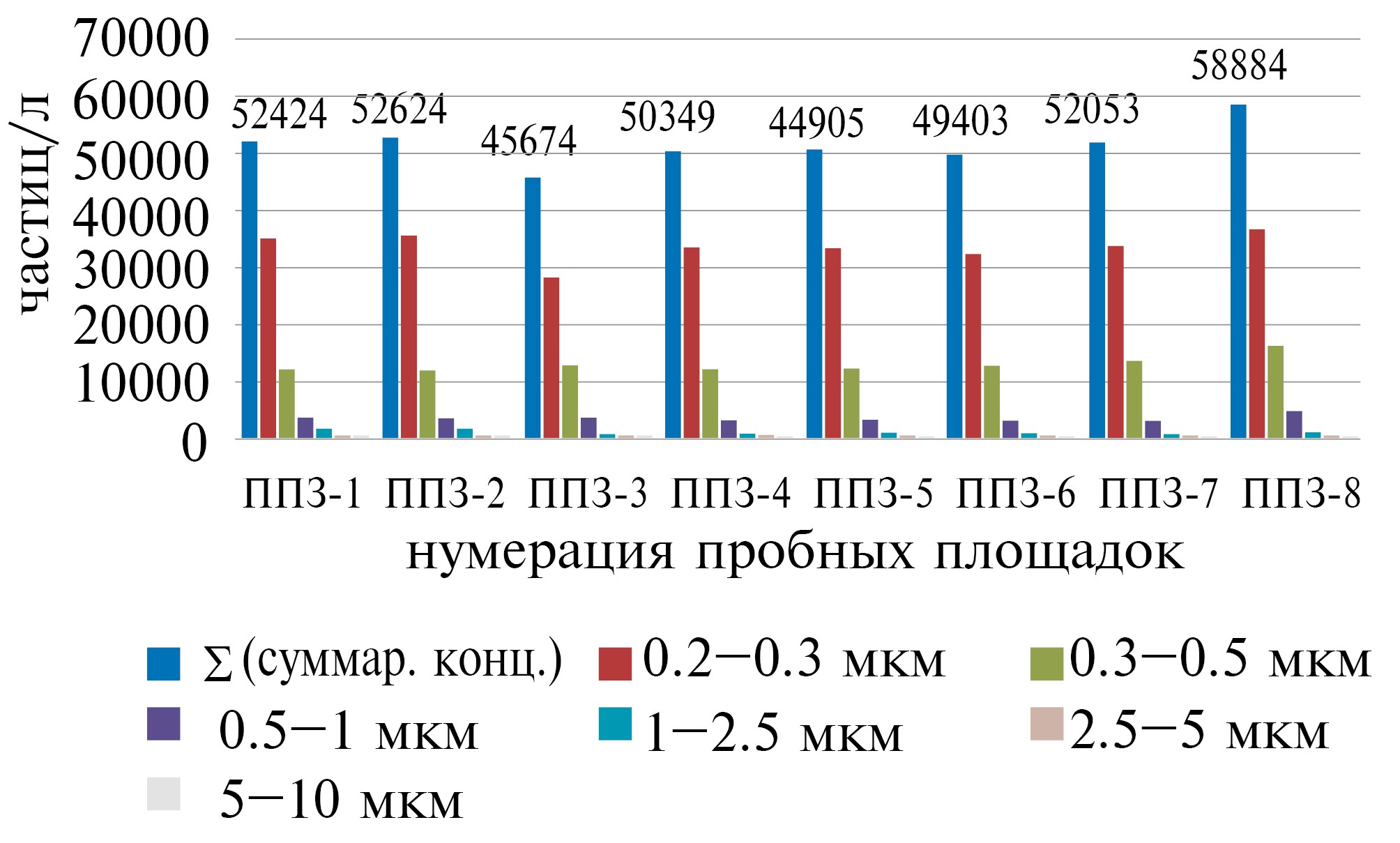 Общие значения суммы аэрозольных частиц (в диапазоне 0–10 мкм) в приземной атмосфере соответствовали фоновым значениям чистой природной среды (∑44905–∑58884 ч-ц/л) с незначительными понижениями на смотровых площадках ПП3-3 (45647 ч-ц/л) и ПП3-5 (49905 ч-ц/л) и небольшими повышениями – на входе/выходе на терренкур на верхней (ПП3-1) и нижней (ПП3-8) станциях маршрута (∑52424 ч-ц/л и ∑58884 ч-ц/л).
