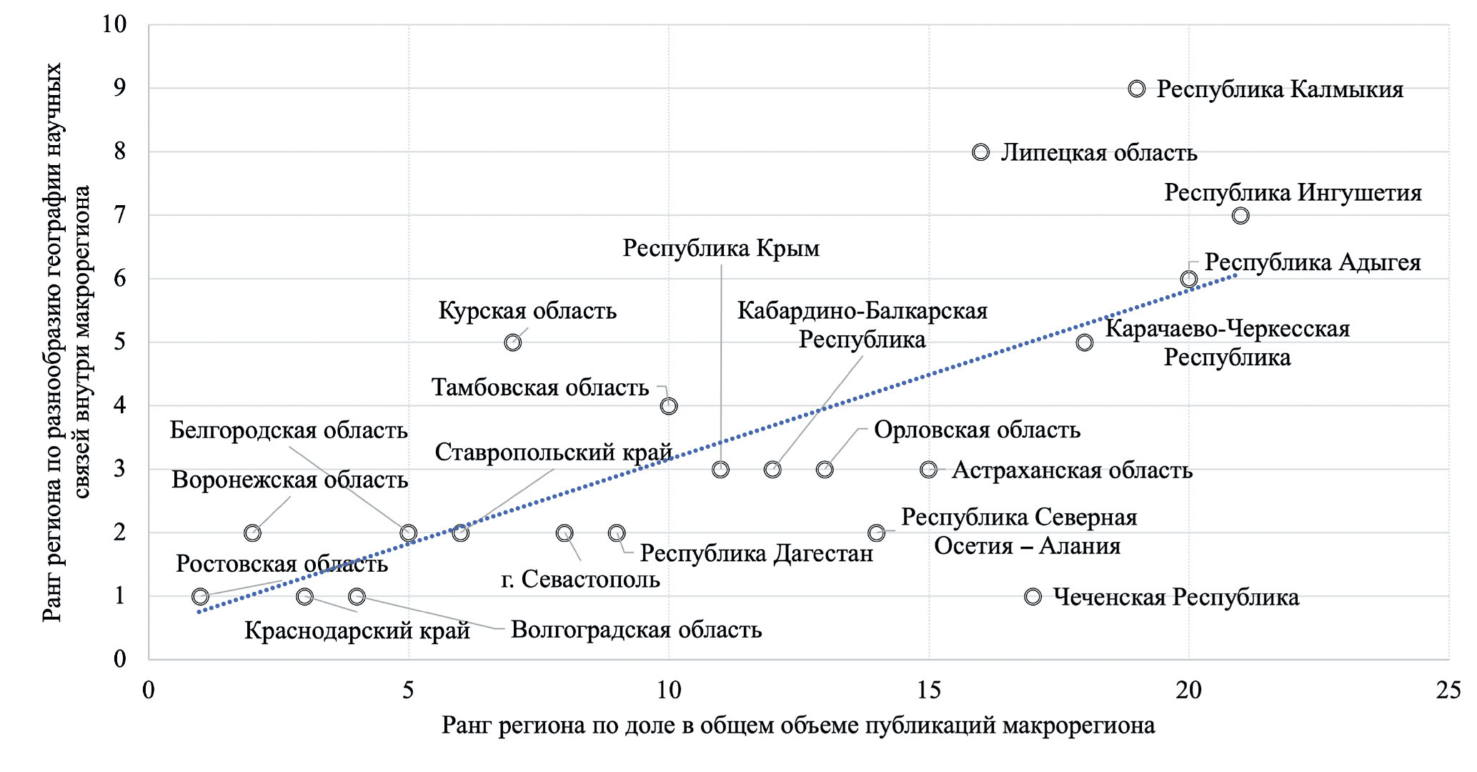 Расчет парной корреляции между публикационной активностью и географическим разнообразием исследовательской сети регионов Большого Юга России указывает на наличие положительной зависимости для этих показателей (0.695) (рис. 5). Можно предположить, что, с одной стороны, более широкий охват исследовательских связей внутри макрорегиона способствует активизации научной деятельности, приросту нового научного знания и генерации большего числа публикаций внутри самого региона. С другой стороны, регионы с более крупными системами производства знания притягивают к себе более мелкие системы посредством каналов перетока, перелива научных знаний и перераспределения интеллектуальных, кадровых, финансовых и иных ресурсов. Это согласуется с результатами ранее проведенных исследований. Например, в (Trippl et al., 2009) показано, что разнообразие источников знаний и механизмов их передачи положительно связано со степенью радикальности инновации. В (Tödtling et al., 2012) на примере сектора информационно-коммуникационных технологий определено, что разнообразие региональных и международных источников знаний – ключевой фактор инноваций.