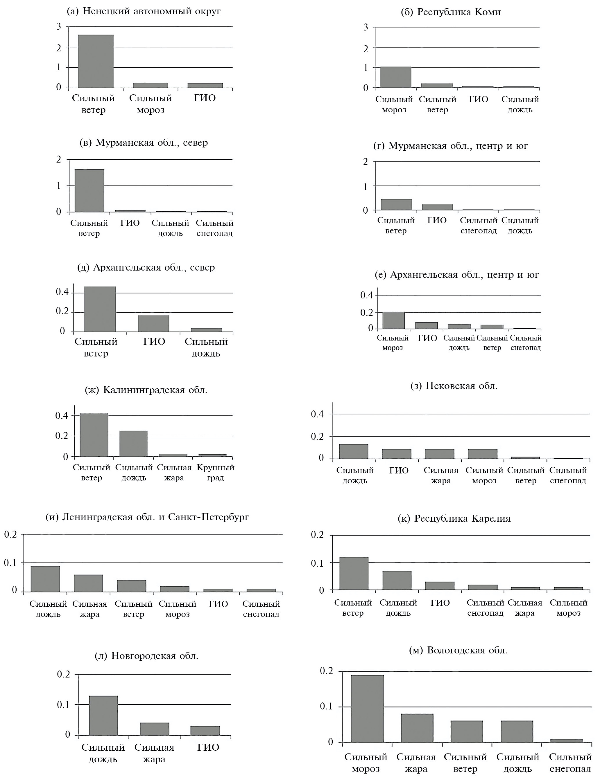 По мере продвижения на юг значение комплексного показателя постепенно снижается до 0.5–0.6. В южных частях Архангельской и Мурманской областей, республиках Коми и Карелии, Вологодской области среднее годовое число случаев с ОЯ уменьшается до 1–2. Однако при этом меняется структура основных составляющих этого показателя. Увеличивается повторяемость экстремальных жидких осадков и волн тепла. Растет число дней с повышенной пожароопасностью и т.д.