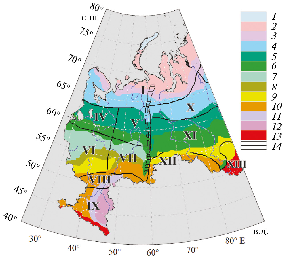 Рис. 1. Квазиоднородные климатические регионы (границы показаны линиями черного цвета): I – атлантическая Арктика; IV, V, VI, VII, VIII – северо-запад, северо-восток, юго-запад, юго-восток и степная часть Восточно-Европейской равнины; IX – степи и предгорье Северного Кавказа; X, XI – северная и южная части лесной зоны Западной Сибири, XII – степная зона Западной Сибири (Доклад …, 2023). Цветом показаны ландшафтные зоны (Национальный …, 2007, с. 398–399): 1 – арктические пустыни, 2 – тундра, 3 – лесотундра, 4 – северная тайга, 5 – средняя тайга, 6 – южная тайга, 7 – подтаежная зона, 8 – широколиственно-лесная, 9 – лесостепь, 10 – степь, 11 – сухая степь, 12 – полупустыня, 13 – высокогорные ландшафты, 14 – низкогорные ландшафты