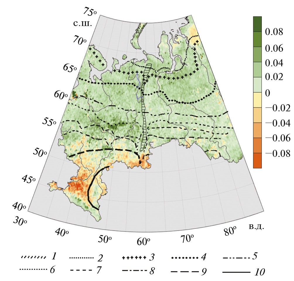 Рис. 2. Тренд NDVI/10 лет за летний период 2000–2022 гг. Тренд значим при значениях больше (меньше) 0.02/10 лет. Границы ландшафтных зон/подзон: 1 – арктические, 2 – тундровые, 3 – лесотундровые, 4 – северотаежные, 5 – среднетаежные, 6 – южнотаежные, 7 – подтаежные, 8 – широколиственные леса, 9 – лесостепные, 10 – степные типичные и сухостепные