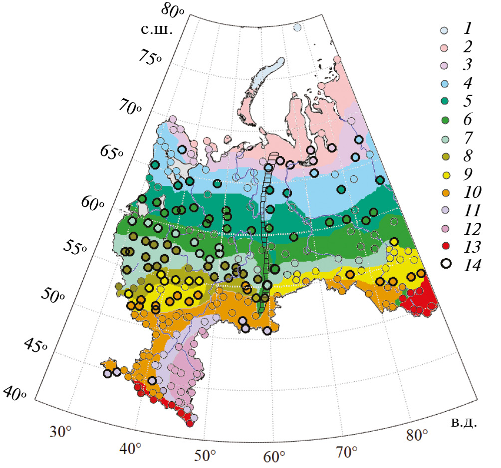 Рис. 3. Климатические предпосылки возможных изменений в ландшафтных зонах/подзонах равнин России по метеостанциям. Цвет метеостанции показывает ее соответствие ландшафтной зоне до 2000 г.: 1 – арктические пустыни, 2 – тундра, 3 – лесотундра, 4 – северная тайга, 5 – средняя тайга, 6 – южная тайга, 7 – подтаежная зона, 8 – широколиственно-лесная, 9 – лесостепь, 10 – степь, 11 – сухая степь, 12 – полупустыня, 13 – высокогорные ландшафты, 14 – климатические показатели в современном климате (2000–2020 гг.) не соответствуют ландшафтной зоне. Обозначения ландшафтных зон см. на рис. 1
