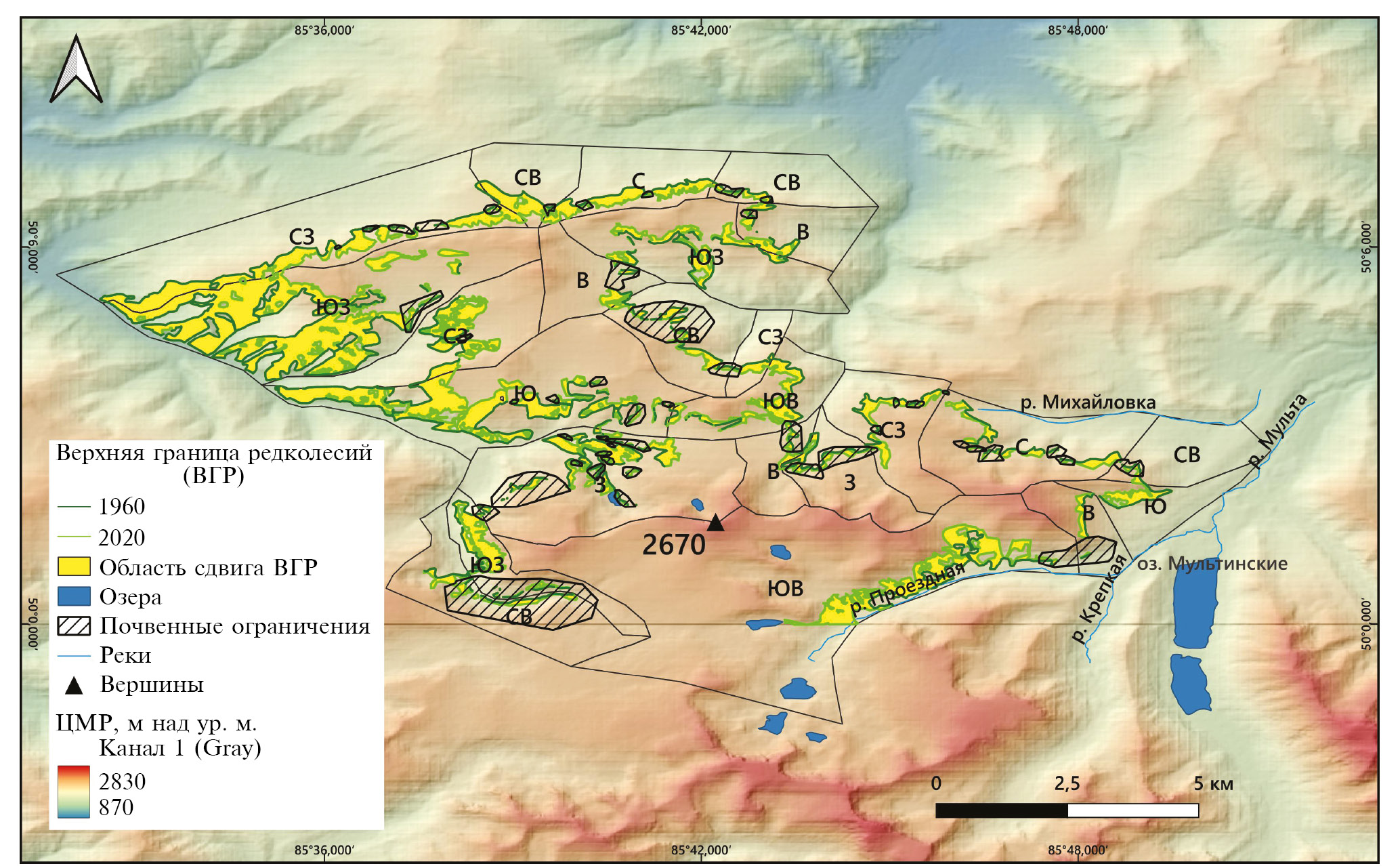 Для изучаемых склонов на основании топографической карты масштаба 1 : 500 м был получен единый полигон границ лесов и редколесий для 60-х годов XX в. На основе привязанного растра топографической карты в SAGA GIS автоматически выделялись области с древесной растительностью. Далее по описанной выше методике была получена консолидированная линия границы древостоев в виде полигона. Для определения значений сомкнутости древостоев, выделенных на топографических картах, на отдельных участках была проведена реконструкция этого параметра с помощью лидарной съемки и древесно-кольцевого анализа, в результате которого было получено значение 20–40%. Путем пересечения слоев лесов и редколесий разных временных интервалов был получен полигон сдвига верхней границы редколесий, используемый для расчета площади сдвига при исключении областей ≥1 га, не занятых деревьями. По спутниковым изображениям высокого разрешения из открытых источников (Google, ArcGIS MapServer) была проведена визуальная коррекция этого полигона с целью выделения современных границ древостоев с сомкнутостью ≥20%. По этим же снимкам были выделены полигоны областей, где предположительно на положение верхней границы редколесий влияли неблагоприятные почвенные условия (каменистые или избыточно увлажняемые участки, моренные отложения). Таким образом, вся исследуемая линия распространения редколесий дифференцировалась на два типа: климатическая (выше границы распространения редколесий есть все благоприятные почвенные условия для заселения древесных видов – тундры, луга) и эдафическая (выше линии распространения редколесий имеются неблагоприятные почвенные условия, сдерживающие возобновление древесных видов). Территории, подверженные выпасу скота в прошлом или настоящем, были исключены из анализа. По цифровой модели рельефа (SRTM, разрешение 30 м/пиксель) происходило разделение на макросклоны по преобладающей экспозиции: юго-восток, юг, юго-запад, запад, северо-запад, север, северо-восток, восток (рис. 2). Цифровая модель рельефа использовалась для получения высотных отметок вдоль выделенных границ. Для расчета продвижения редколесий по высоте линии их верхней границы распространения в 1960-х и 2020-х годах, они были преобразованы в слой точек с интервалом 12 м. В атрибуты этого слоя из соответствующих растров и полигонов при помощи модуля Point Sampling Tool в QGIS была включена информация об экспозиции макросклона, влиянии почвенных условий, высоте над уровнем моря. Далее были проведены расчеты медианы для высотного расположения верхней границы редколесий в начале и конце анализируемого периода для склонов разных экспозиций и с учетом участков, различных по почвенным условиям. Также были рассчитаны горизонтальные и площадные сдвиги верхней границы редколесий.