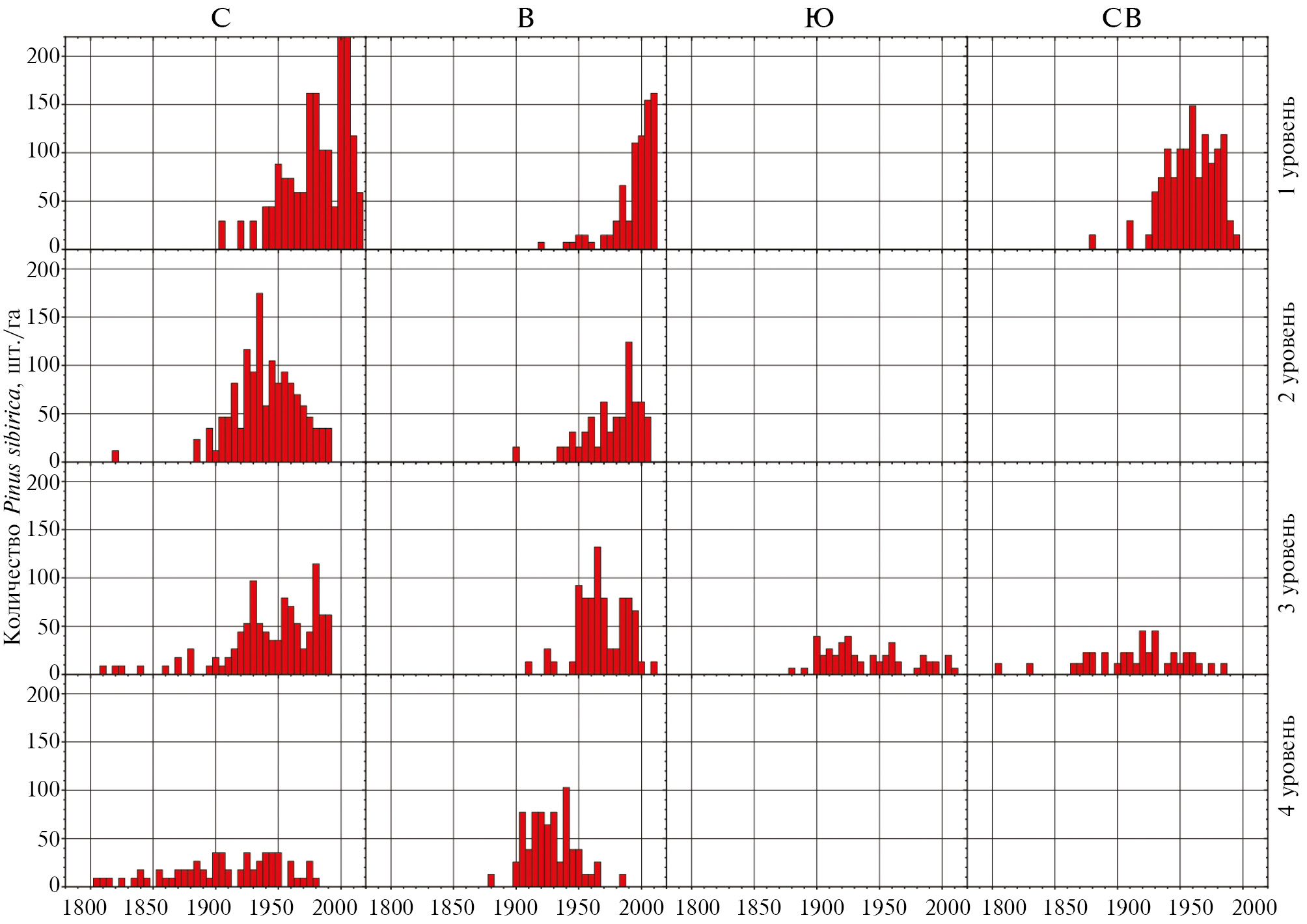 Анализ представленных на рис. 3 данных свидетельствует о том, что заселение восточного склона кедром началось только в конце ХIХ в. на нижнем высотном уровне. На высотных уровнях 1, 2 и 3 деревья стали появляться только в 1920-х годах. Чем ниже высота над ур. м., тем раньше происходил период массового заселения восточного склона кедром, в частности, всплеск появления деревьев на верхнем высотном уровне охватывает период с 1995 по 2015 г., когда появилось 72% существующих особей. На северном склоне заселение кедром происходило по иному сценарию. Первые деревья на данном склоне стали появляться еще в середине XV в. на нижнем высотном уровне. На высотных уровнях “4”, “3” и “2” отдельные деревья заселялись в течение всего ХIX в. без явных пиков их численности. В целом, наиболее массовые периоды пополнения деревьев наблюдаются на протяжении ХХ в., однако раньше на 30–40 лет по сравнению с восточным склоном. На северо-восточном склоне в пределах высотного уровня “3” первые деревья стали появляться в XVII в., далее весь XIX и XX вв. пополнение кедром было поступательным без явных пиков численности. На верхнем высотном уровне массовое заселение деревьев происходило после 1930-х годов и продолжается по настоящее время. На южном склоне основной период массового заселения деревьев произошел в период с 1900 по 1940-е годы.
