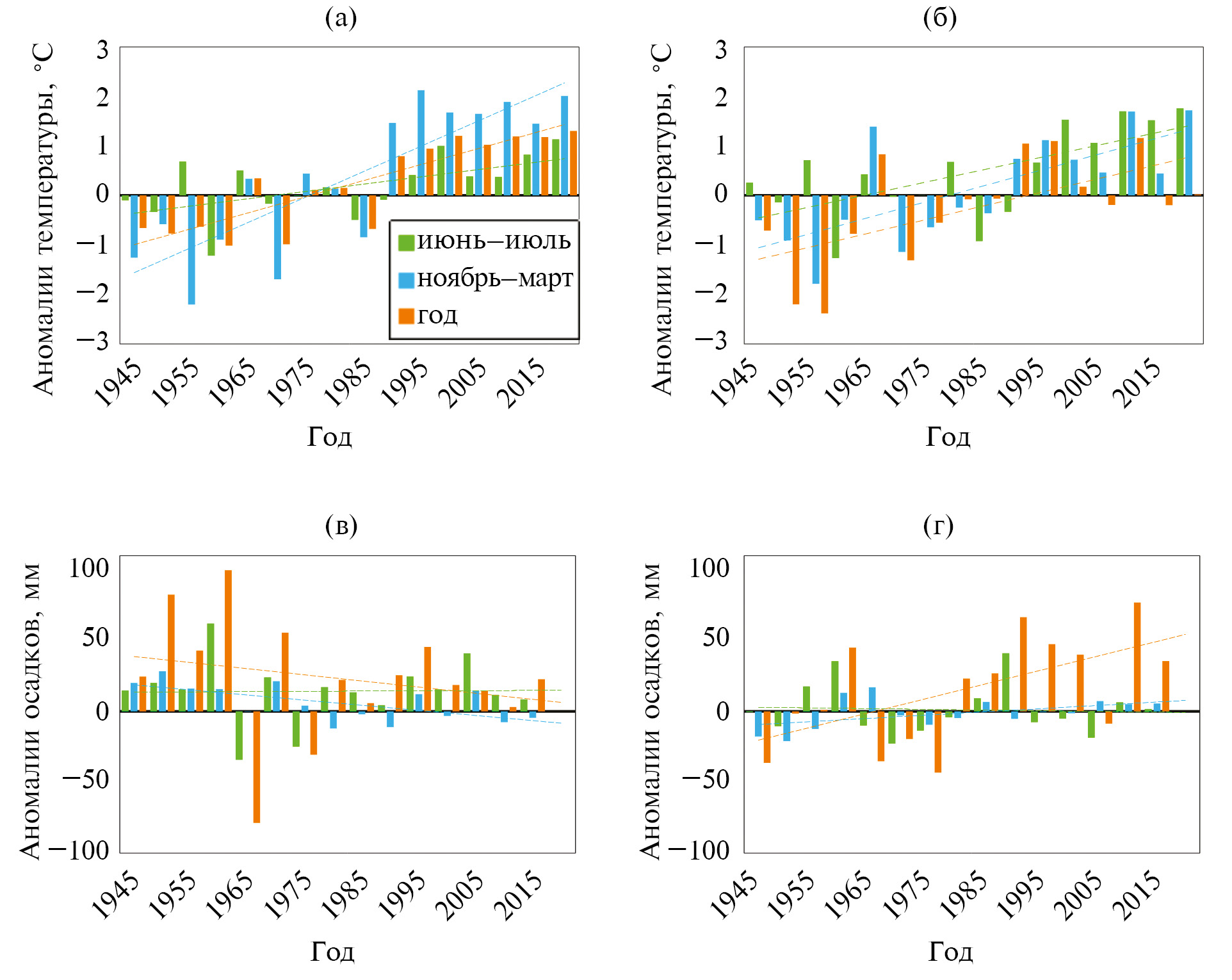 Рис. 4. Временные ряды аномалий средней температуры воздуха и суммарных осадков на метеостанциях Усть-Кокса (а, в) и Кара-Тюрек (б, г). Пунктирной линией обозначен линейный тренд