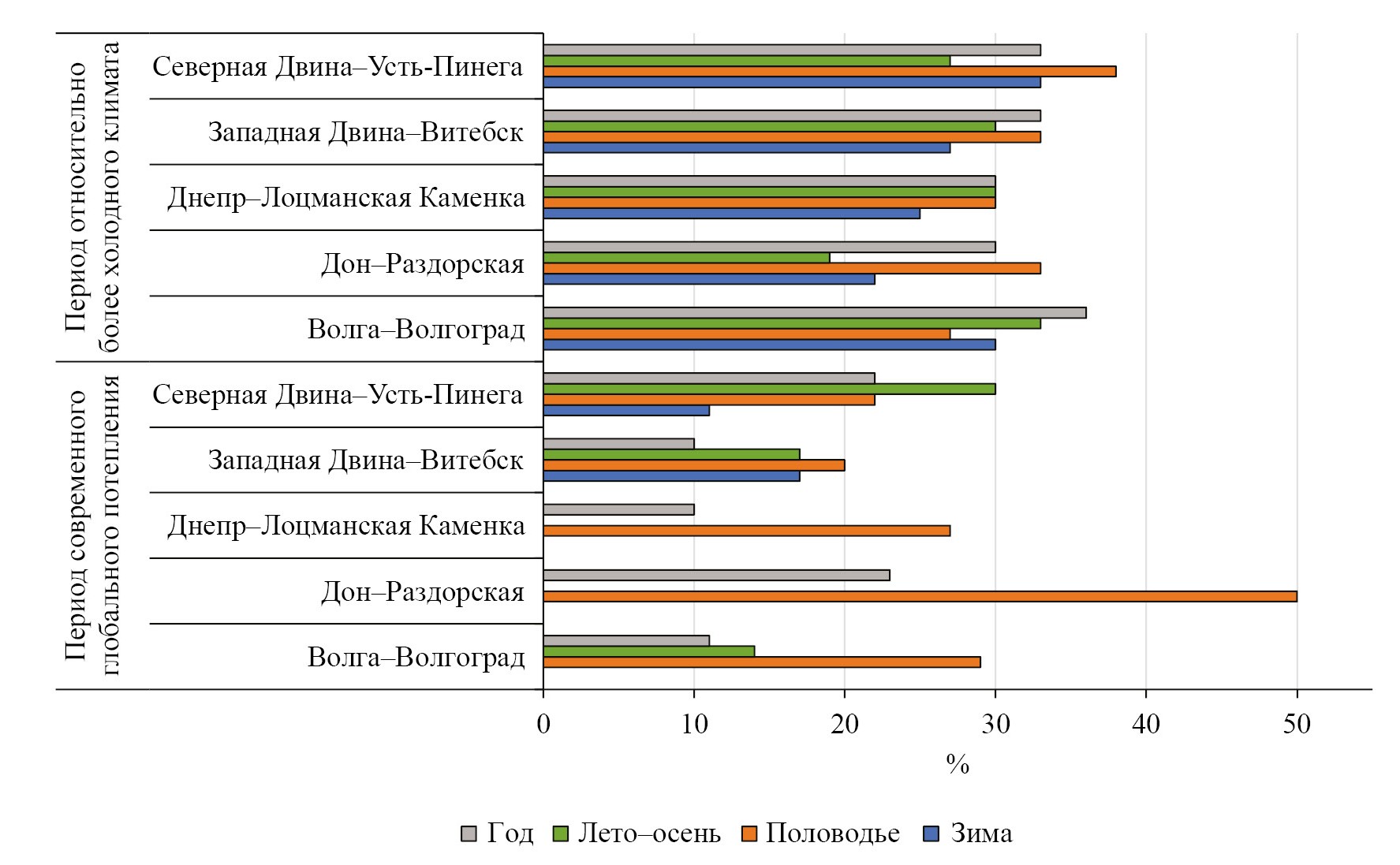 В многолетних изменениях рассмотренных рек Русской равнины (Волга – Старица, Москва – Можайск, Днепр – Орша, Ока – Калуга, Дон – Казанская, Сейм – Рыльск, табл. 4) за весь более чем вековой период наблюдений (на Сейме более чем 80-летний) выявлены две продолжительные контрастные фазы повышенного и пониженного стока гидрологических сезонов (Georgiadi and Groisman, 2023). При этом, для половодья сначала наблюдалась фаза повышенного стока, которая сменилась в 1960 г. на Днепре, в 1969 г. на Волге, в 1972 г. (на Сейме, Оке и Дону), в 1989 г. (на Москве у Можайска) на фазу пониженного стока. Для меженных периодов, напротив, сначала наблюдались фазы пониженного стока, а затем практически синхронно на всех рассмотренных реках (в 1978–1981 гг.) наступила фаза повышенного стока. При этом границы последних наблюдавшихся фаз, как правило, близки к границам периода современного глобального потепления. Характер же фаз годового стока существенно отличается между реками. Продолжительность долговременных фаз находится в пределах 28–99 лет. Разница в стоке контрастных фаз составляет (в процентах от стока в фазу его пониженных значений) от 18 до 144%. При этом наибольших значений разница в стоке, как правило, достигает в меженные сезоны года, а наименьших для годового стока.