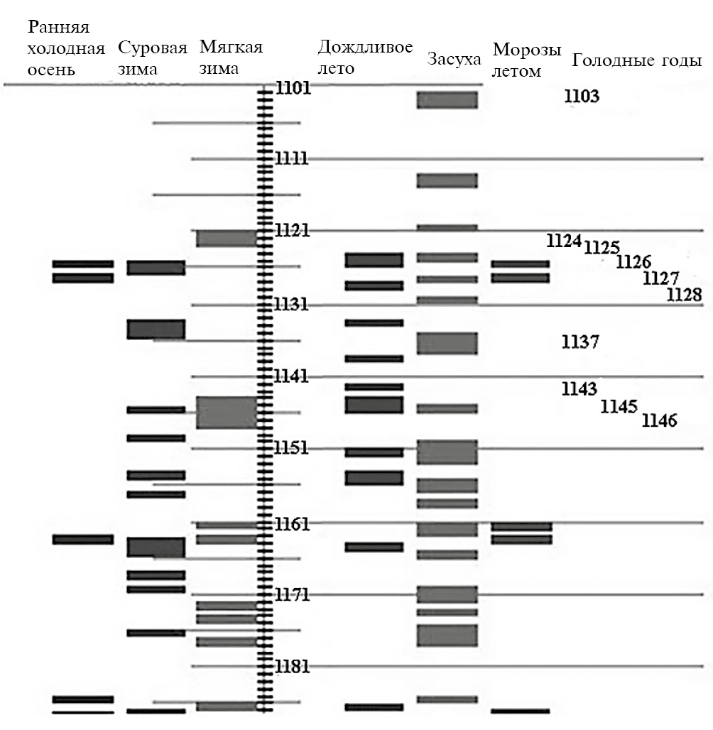 Особое внимание при этом уделено анализу ландшафтно-эдафических и климатических условий формирования поселенческой структуры данного региона. Основой для получения сведений об изменениях климата, неблагоприятных и опасных природных явлениях (особенно экстремальных) на исследуемый период послужил комплексный анализ летописных и литературных источников, а также результатов дендрологических, спорово-пыльцевых, радиоуглеродных и др. исследований, проводившихся как на этой территории, так и в аналогичных ландшафтно-зональных условиях. В первую очередь было обращено внимание на сведения о проявлении экстремальных природных явлений и их частоте, так как именно интенсивность и повторяемость экстремальных природных явлений влияют на функционирование и динамику ландшафтов и, соответственно, определяют особенности ведения хозяйства и даже всего исторического развития. Не случайно экстремальные природные явления постоянно привлекают повышенное внимание многих исследователей (Боголепов, 1907; Борисенко, Пасецкий, 1983, 1988; Кренке, Чернавская, 1998; Ле Руа Ладюри, 1971; Ляхов, 1984; Раунер, 1981). Нами, совместно со студентами, на протяжении многих лет делались выборки основных климатических характеристик и экстремальных природных явлений, а по итогам проведенной работы составлены сводные таблицы-графики их регистрации за каждый год, начиная с 900 г. н. э. (рис. 1). В этих таблицах-графиках указаны как прямые климатические характеристики: жарко, тепло, холодно, влажно, засуха и т. п. с характеристикой сезонов, так и экстремальные (аномальные) природные явления. Фиксировалась также и опосредованная информация об изменчивости климата (наводнения, неурожаи, голодные годы, массовые эпидемии т. д.). Такая сводная таблица-график позволяет наглядно оценить климатические условия, включая экстремальные явления, жизнедеятельности поселенцев средневековья в регионе Верхневолжья (Низовцев, Эрман, 2015).