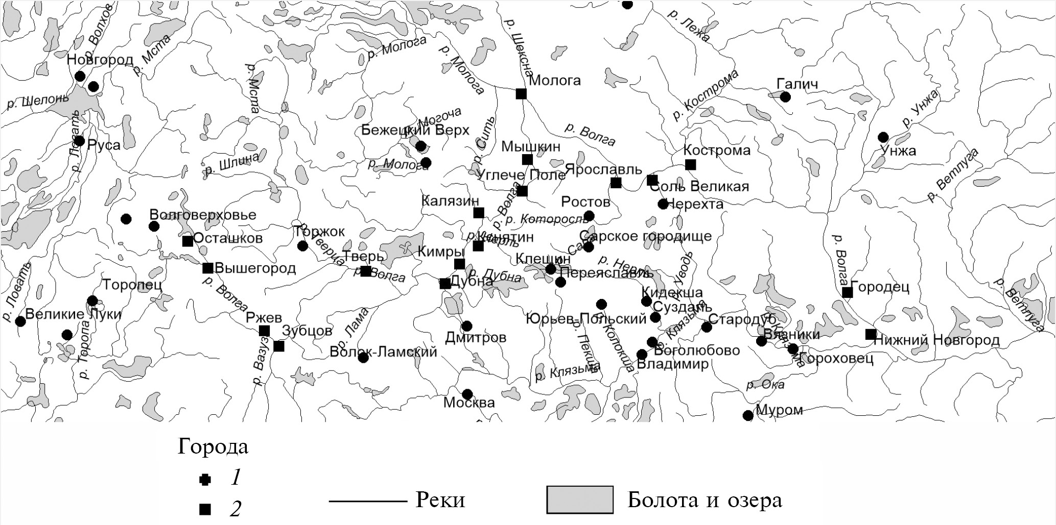 Рис. 2. Древнерусские большие и летописные города XII–XIII вв. [по (Куза, 1989)] на Верхневолжском отрезке Великого Волжского исторического пути: 1 – древнерусские большие и летописные города; 2 – Верхневолжские древнерусские большие и летописные города