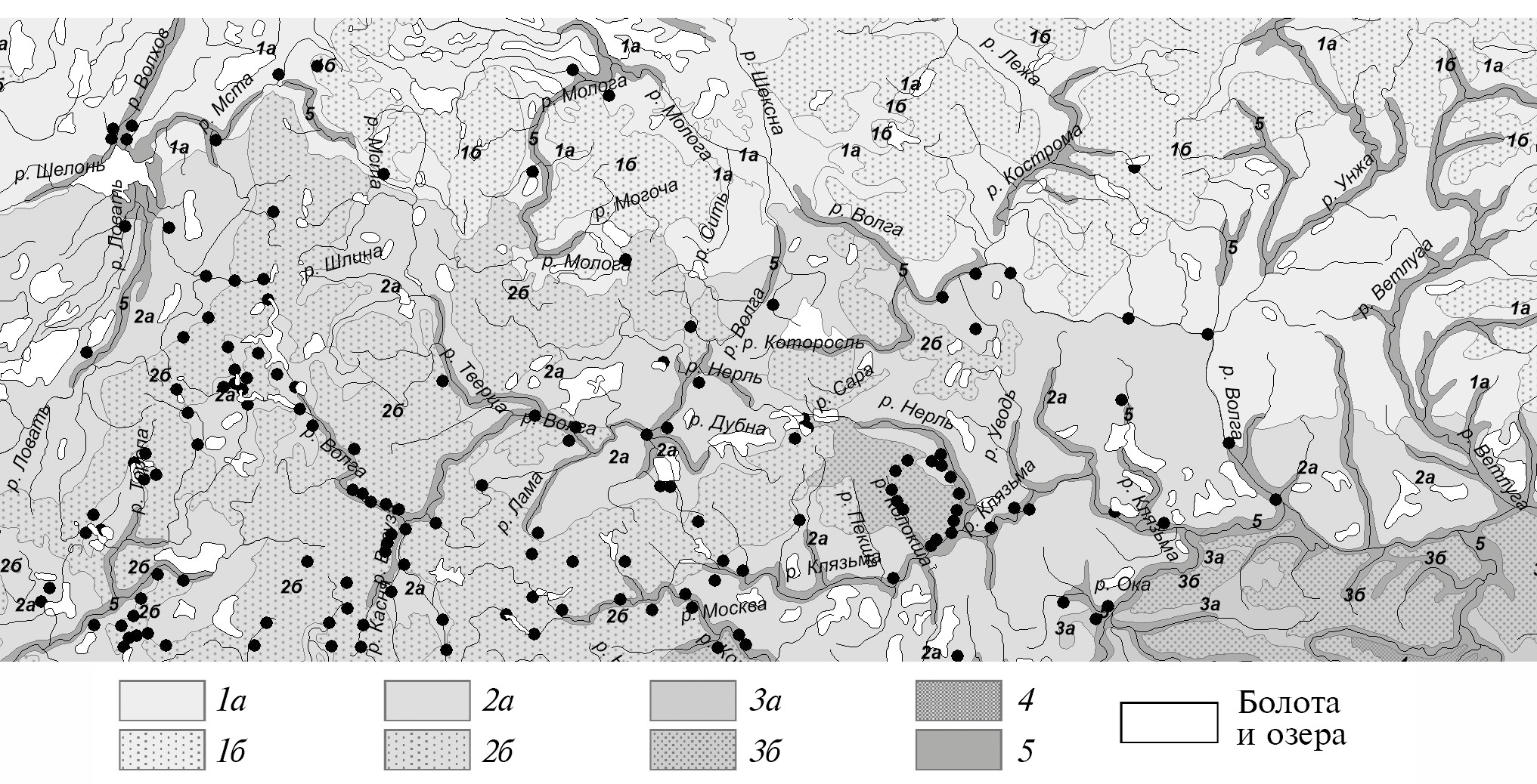 Рис. 3. Древнерусские города и укрепленные поселения XII–XIII вв. [по (Куза, 1989)] на карте типов ландшафтов (Ландшафтная карта СССР: для вузов / гл. ред. А.Г. Исаченко. Масштаб 1 : 4000000. М.: ГУГК, 1988. Фрагмент): 1а, 1б – южная тайга; 2а, 2б – смешанные леса; 3а, 3б – широколиственные леса (семигумидные); 4 – лесостепь; 5 – долинные комплексы; а – низменные равнины; б – возвышенные равнины