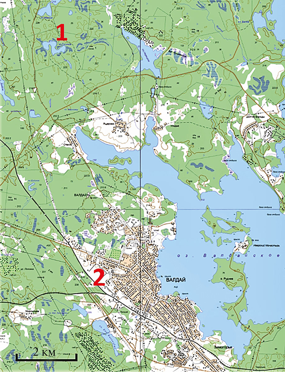 Рис. 1. Расположение экспериментальной площадки: 1 — оз. Гусиное; 2 — г. Валдай