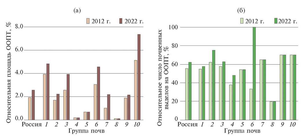 В целом по стране с 2012 г. репрезентативность системы федеральных ООПТ в отношении почвенного разнообразия увеличилась на 7% (см. рис. 3б). Самая малочисленная группа почв субтропиков в настоящее время полностью обеспечена охраной. Для группы почв тайги и хвойно-широколиственных лесов степень обеспеченности охраны почвенного разнообразия увеличилась на 13%. Ранее отмечалось (Снакин и др., 2019; Чернова, 2016), что дерново-подзолистые почвы со вторым гумусовым горизонтом и большая группа палевых почв, занимающие на территории России значительные площади, вовсе не были представлены на охраняемых территориях. За счет организации национального парка Ленские столбы представленность разнообразия палевых почв увеличилась на 4 типа, а Васюганского заповедника — на один тип дерново-подзолистых почв со вторым гумусовым горизонтом.