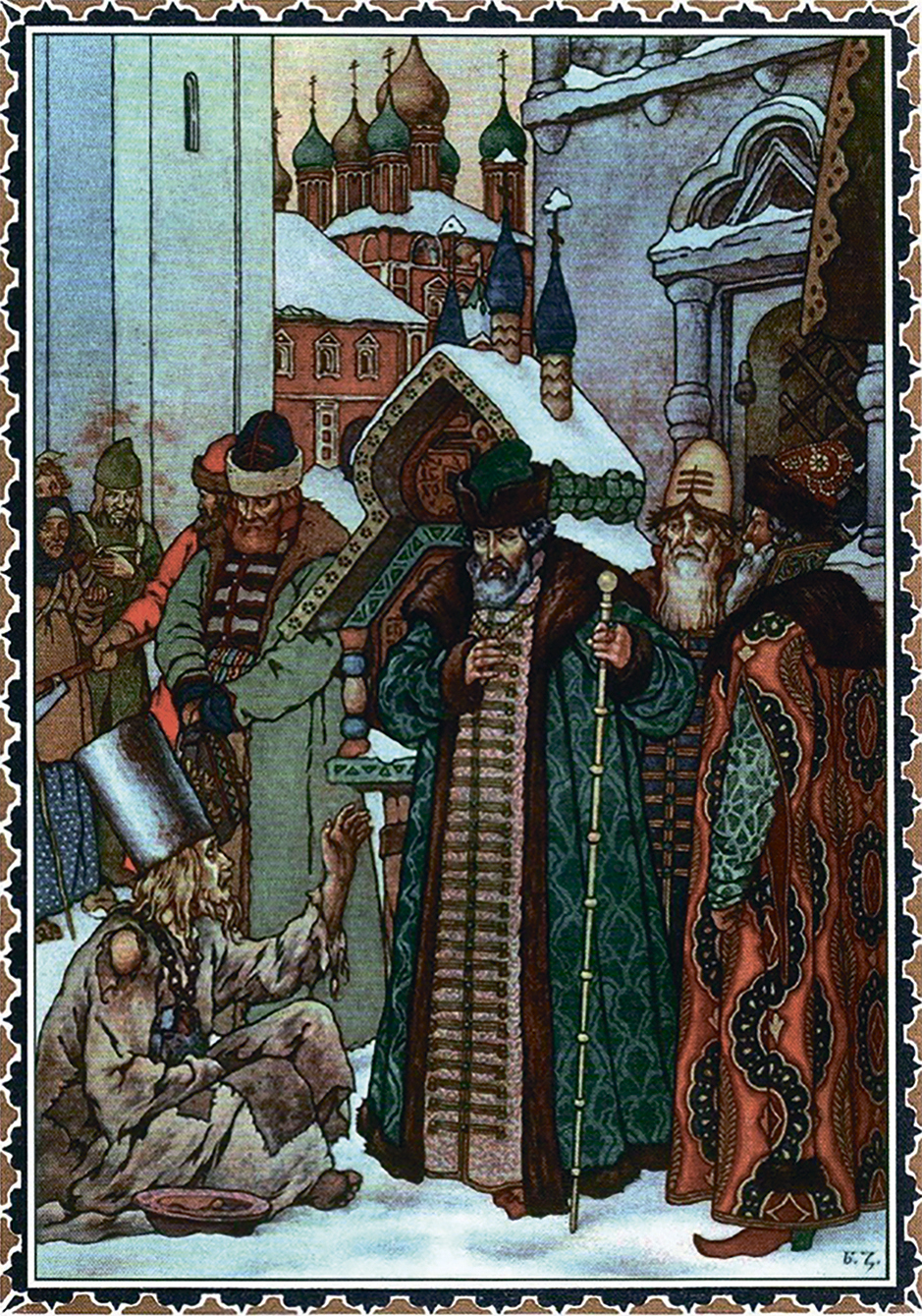 Истину несут герои, связанные с православной верой: это летописец Пимен и юродивый, обличающие Бориса Годунова. Юродивый в ответ на просьбу Бориса Годунова помолиться за него возражает, что «нельзя молиться за царя Ирода — Богородица не велит» (Пушкин, т. 5, с. 260). Невинно убиенный младенец соотносится с Христом, а его гонитель — с Иродом (ил. 4).