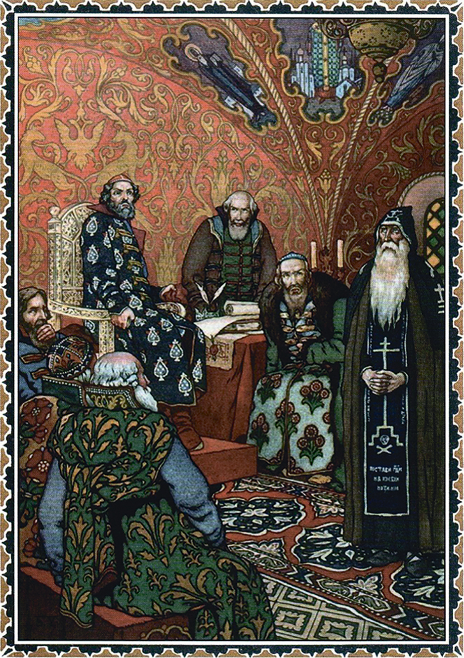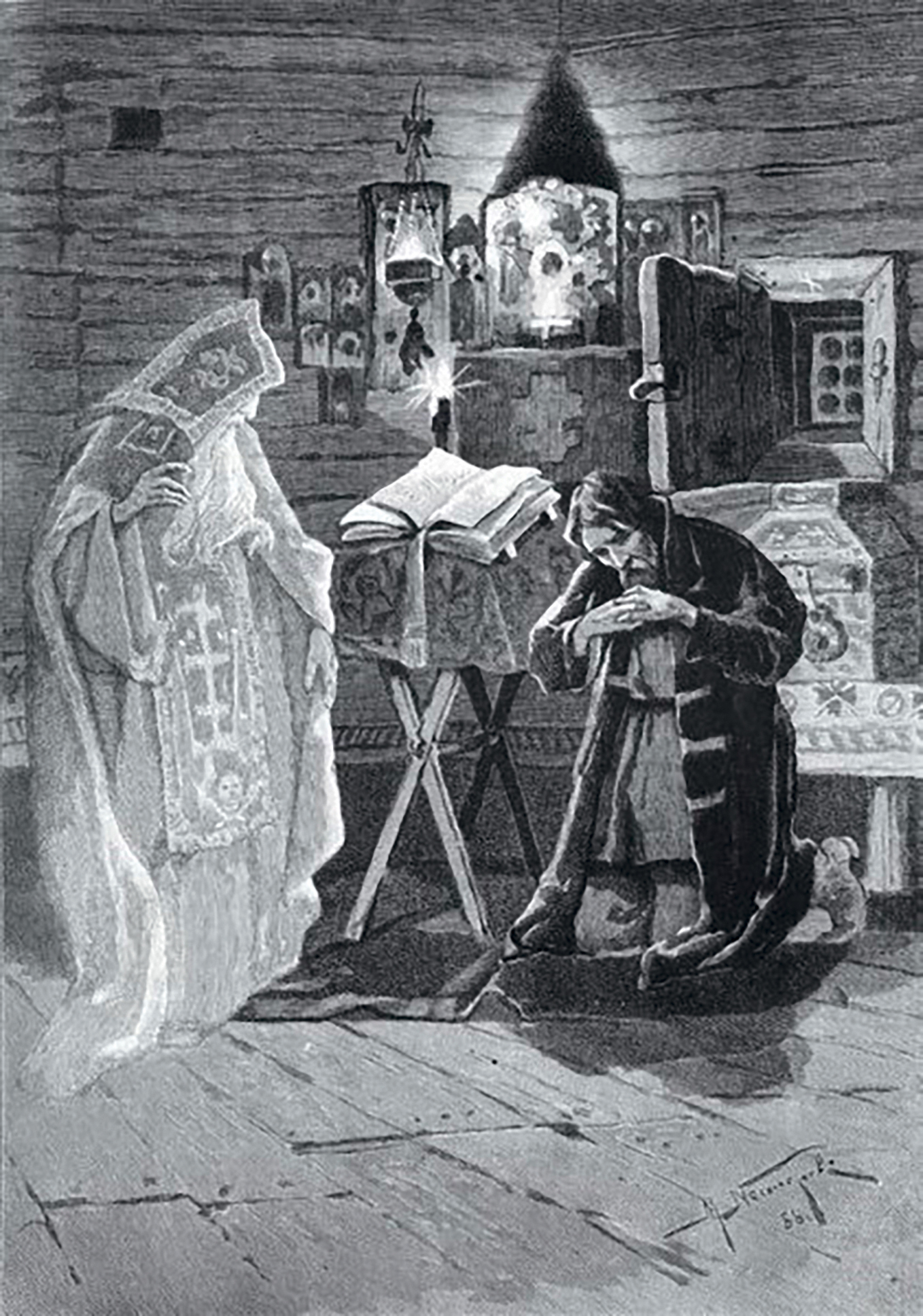 Однако в трагедии Пушкина есть мотив, который не встречается у Шекспира, поскольку он обращает читателя к национальным традициям. В библиотеке Пушкина находилось «Сказание о Мамаевом побоище» [12, с. 9], аллюзию к которому Пушкин вкладывает в уста Годунова. Речь идёт об участии в Куликовской битве монахов Свято-Троицкой лавры, которых благословил на битву преп. Сергий Радонежский (ил. 3). Борис Годунов размышляет: «…В прежни годы, / Когда бедой Отечеству грозило, / Отшельники на битву сами шли, но не хотим тревожить ныне их» (Пушкин, т. 5, с. 290). Мотив отказа Бориса Годунова от помощи небесных сил повторяется в сцене с патриархом Иовом, который предлагает перенести мощи царевича Димитрия в собор Михаила Архангела, небесного покровителя воинов.