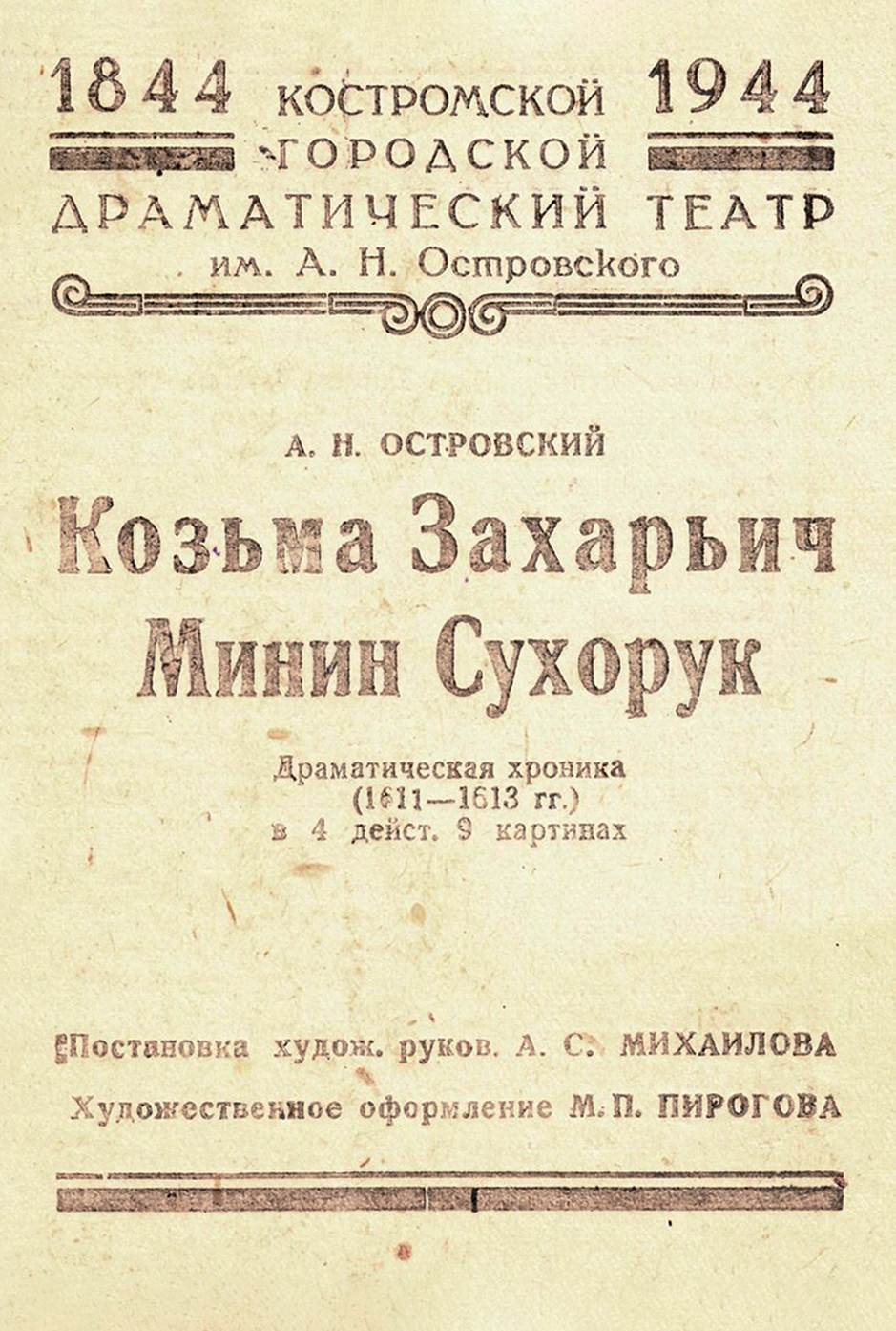 Создавая драму «Козьма Минин, Сухорук» (1861, 1866), А.Н. Островский продолжал традиции своих предшественников (ил. 6). Однако если А.К. Толстой больше следует за Шекспиром, нежели Пушкин, то Островский развивает черты исторической национальной драмы. Есть у него герои, которые были в стане Самозванца и продолжают нести смуту, — Биркин и его слуга Павлик. Им противопоставлены праведники: Минин, «выборный всей земли Русской», чувствующий, что его ведёт Промысел Божий, и вдова купца Марфа Борисовна, как называет её Минин, «святая душа». Минин говорит о том, что враг силён Божьим гневом, но «Господь не век враждует против нас / И грешнику погибели не хочет. / Враг одолел, творя его веленье, / Смирились мы, и нам Господь пошлёт / победу на врага и одоленье»10. Марфа Борисовна даёт зарок не выходить замуж, пока «Господень гнев не утолится» (Островский, т. 4, с. 369). Мотив Божьего суда и искупления вины страданием восходит также к «Сказанию о Мамаевом побоище».