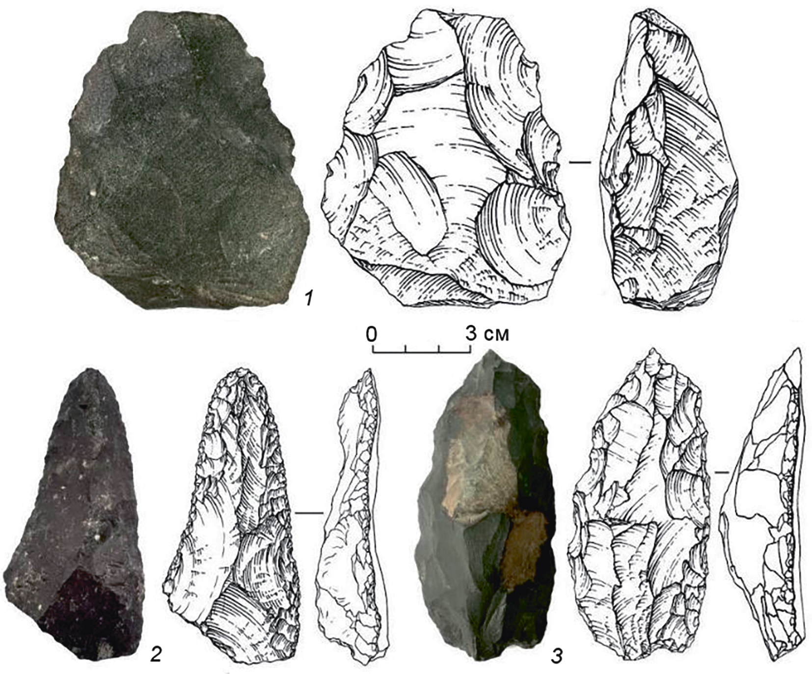 Ил. 2. Древнейшие каменные орудия денисовцев: 1 — вентрально-утончённый скол; 2, 3 — скребла